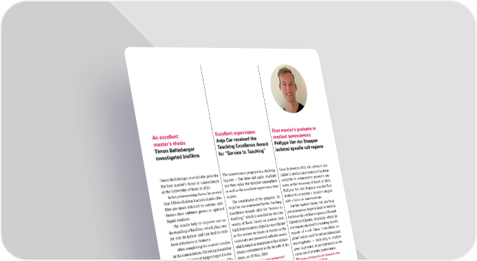 An excellent Excellent supervision First master’s graduate in master’s thesis Anja Car received the medical nanosciences Timon Baltisberger Teaching Excellence Award Philippe Van der Stappen investigated bio昀椀lms for “Service to Teaching” isolated speci昀椀c cell regions Timon Baltisberger received the prize for The nanosciences program is a challeng- Since September 2021, the option to spe- the best master’s thesis in nanosciences ing one — but time and again, students cialize in medical nanosciences has been at the University of Basel in 2023. say they value the familiar atmosphere available to nanoscience master’s stu- In his prizewinning thesis, he proved as well as the excellent supervision they dents at the University of Basel. In 2023, that Vibrio cholerae bacteria inside a bio- receive. Philippe Van der Stappen was the 昀椀rst 昀椀lm are more tolerant to various anti- The coordinator of the program, Dr. student to complete a master’s degree biotics than cultures grown in agitated Anja Car, was nominated for the Teaching with a focus on nanomedicine. liquid medium. Excellence Awards 2023 for “Service to For his master’s thesis, Van der Stap- The results help to improve our un- Teaching,” which is awarded by the Uni- pen received an Argovia Grant to work in derstanding of bio昀椀lms, which play a ma- versity of Basel, based on positive feed- Professor Alex de Marco’s group at Monash jor role in nature and can lead to stub- back from students. Anja Car was selected University (Clayton, Australia), where he born infections in humans. as the winner by deans of studies at the developed a method for isolating speci昀椀c After completing his master’s studies university and presented with the award, regions of a cell. These “subcellular re- in the nanosciences, the young researcher which stands as testament to her extraor- gions” can be used for various subsequent from the Canton of Aargau began his doc- dinary commitment to the bene昀椀t of stu- investigations — including to analyze toral dissertation at the University of Ba- dents, on 25 May, 2023. gene expression (transcriptomics) or the sel — albeit not, as one might imagine, Article on Anja Car’s career background: entire set of proteins (proteomics). on a biological/medical topic but rather https://bit.ly/3UN5MrK Article on Philippe Van der Stappen’s time in quantum physics. Once again, this Video with Anja Car: abroad: https://bit.ly/42NH3pb demonstrates how diverse an education https://youtu.be/mgfWGBSfYCg the nanoscience students receive. Article on Timon Baltisberger’s master’s thesis: https://bit.ly/3ORDA3a Video with Timon Baltisberger: “Through her tireless commit- “What makes particularly https://youtu.be/4zZjnvX-qUQ ment, Anja Car makes a vital notable about the specializa- contribution to the success of tion in medical nanoscience is the unique nanoscience degree the range of lectures covering program. As coordinator, she multiple departments that “In his master’s thesis, Timon achieves the extraordinary — provide unique insights into paved the way for investigating from both an organizational everything from molecular the effectiveness of antibiotics and a human perspective.” medicine to biocompatibility in bacterial communities.” Professor Philipp Habegger and the analysis of data from Professor Knut Drescher, Dean of Studies, imaging techniques.” Biozentrum, University of Basel Faculty of Science, Philippe Van der Stappen, University of Basel Biozentrum, University of Basel 14 SNI Annual Report 2023