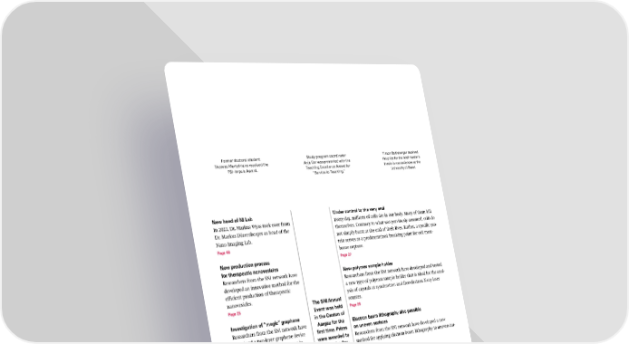 Former doctoral student Study program coordinator Timon Baltisberger received Thomas Mortelmans received the Anja Car was presented with the the prize for the best master’s PSI-Impuls Award. Teaching Excellence Award for thesis in nanosciences at the “Service to Teaching.” University of Basel. New head of NI Lab Under control to the very end In 2023, Dr. Markus Wyss took over from Every day, millions of cells die in our body. Many of them kill Dr. Markus Dürrenberger as head of the themselves. Contrary to what was previously assumed, cells do Nano Imaging Lab. not simply burst at the end of their lives. Rather, a speci昀椀c pro- Page 46 tein serves as a predetermined breaking point for cell mem- brane rupture. New production process Page 27 for therapeutic nanovesicles Researchers from the SNI network have New polymer sample holder developed an innovative method for the Researchers from the SNI network have developed and tested e昀케cient production of therapeutic a new type of polymer sample holder that is ideal for the anal- nanovesicles. ysis of crystals at synchrotron and free-electron X-ray laser Page 25 The SNI Annual sources. Event was held Page 28 Investigation of “magic” graphene in the Canton of Researchers from the SNI network have Aargau for the Electron beam lithography also possible examined a two-layer graphene device 昀椀rst time. Prizes on uneven surfaces using an atomic force microscope in were awarded to Researchers from the SNI network have developed a new pendulum mode and demonstrated that Alessandro Bru- method for applying electron beam lithography to uneven sur- the method they used allows 昀椀ne-tuning no for his excel- faces. of not only current 昀氀ow but also magne- lent poster and Page 29 tization in the device. Elizaveta Mak- Page 25 simova for her excellent talk. Increased coherence thanks to cooling A team of researchers has extended the coherence of an electron spin in a gal- lium arsenide quantum dot to over half a microsecond for the 昀椀rst time. They achieved this by using the electron spin-nuclear spin interaction, thereby causing the spin system to cool down to 100 microkelvins. Page 26 SNI Annual Report 2023 5