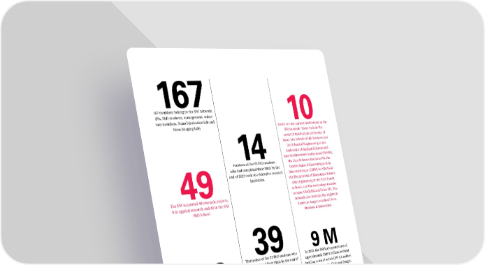 167 167 members belong to the SNI network. (PIs, PhD students, management, volun- tary members, Nano Fabrication Lab and 10 Nano Imaging Lab) There are ten partner institutions in the SNI network. These include the research institutions University of Basel, the School of Life Sciences and the School of Engineering at the University of Applied Sciences and 14 Arts Northwestern Switzerland (FHNW), Fourteen of the 53 PhD students the Paul Scherrer Institute PSI, the who had completed their PhDs by the Centre Suisse d`Electronique et de end of 2023 work at a federal or research Microtechnique (CSEM) in Allschwil, institution. the Department of Biosystems Science and Engineering at the ETH Zurich 49 in Basel, and the technology transfer The SNI supported 49 research projects, centers ANAXAM and Swiss PIC. The 9 in applied research and 40 in the SNI network also includes the Hightech PhD School. Zentrum Aargau and Basel Area Business & Innovation. 39 9 M Thirty-nine of the 53 PhD students who In 2023, the SNI had expenditures of had completed their PhDs by the end of approximately CHF 9 million (without 2023 work in industry. building costs) of which CHF 6.4 million were covered by the Canton of Aargau 82 and CHF 2.6 million by the In 2023, 56 students were enrolled on University of Basel. the bachelor’s program and 26 on the master’s program. 45 80+126 In 2023, a total of 45 peer-reviewed In 2023, 80 clients used the Nano Fabri- papers with participation of SNI cation Lab`s service. The Nano Imaging members were published in renowned Lab received more than 180 orders, science journals. >5500 which often take several days, from 126 The SNI social media channels on di昀昀erent clients. Instagram, LinkedIn, X and YouTube have more than 5,500 followers. SNI Annual Report 2023 9