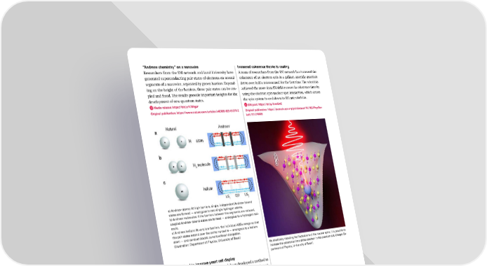 “Andreev chemistry” on a nanowire Increased coherence thanks to cooling Researchers from the SNI network and Lund University have A team of researchers from the SNI network has increased the generated superconducting pair states of electrons on several coherence of an electron spin in a gallium arsenide quantum segments of a nanowire, separated by grown barriers. Depend- dot to over half a microsecond for the 昀椀rst time. The scientists ing on the height of the barriers, these pair states can be cou- achieved the more than 150-fold increase in coherence time by pled and fused. The results provide important insights for the using the electron spin-nuclear spin interaction, which causes development of new quantum states. the spin system to cool down to 100 microkelvins. Media release: https://bit.ly/4764gor SNI post: https://bit.ly/3uwGrrC Original publication: https://www.nature.com/articles/s42005-023-01273-2 Original publication: https://journals.aps.org/prl/abstract/10.1103/PhysRev- Lett.131.210805 a) Andreev atoms: At high barriers, single, independent Andreev bound states are formed — analogous to two single hydrogen atoms. b) Andreev molecules: If the barriers between the segments are reduced, coupled Andreev bound states are formed — analogous to a hydrogen mol- ecule. c) Andreev helium: At very low barriers, the individual ABSs merge so that the pair states extend over the entire nanowire — analogous to a helium atom — and conduct electric current without dissipation. (Illustration: Department of Physics, University of Basel) By drastically reducing the 昀氀uctuations of the nuclear spins, it is possible to increase the coherence time of the electron in the quantum dot. (Image: De- partment of Physics, University of Basel) Method to improve yeast cell display Researchers from the SNI network have developed a method to improve what is known as yeast surface display — a fundamen- tal tool for protein engineering and targeted protein evolution. SNI post: https://bit.ly/3wmRq7n Original publication: https://pubs.acs.org/doi/full/10.1021/acssynbio.2c00351 Genetically modi昀椀ed cells of baker’s yeast (Saccharomyces cerevisiae) syn- thesize proteins of interest on their cell walls using yeast surface display, a tool that enhances engineering and directed evolution of proteins. (Image: © M. Oeggerli/Micronaut, supported by University Hospital Basel and the Biozentrum of the University of Basel) 26 SNI Annual Report 2023