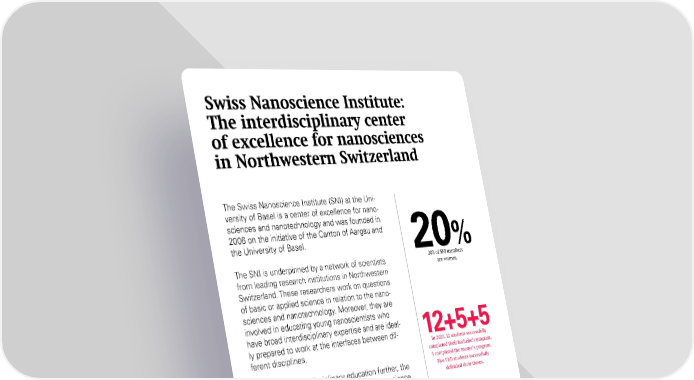 Swiss Nanoscience Institute: The interdisciplinary center of excellence for nanosciences in Northwestern Switzerland The Swiss Nanoscience Institute (SNI) at the Uni- versity of Basel is a center of excellence for nano- sciences and nanotechnology and was founded in 2006 on the initiative of the Canton of Aargau and the University of Basel. 20% The SNI is underpinned by a network of scientists 20% of SNI members from leading research institutions in Northwestern are women. Switzerland. These researchers work on questions of basic or applied science in relation to the nano- sciences and nanotechnology. Moreover, they are involved in educating young nanoscientists who have broad interdisciplinary expertise and are ideal - 12+5+5 ly prepared to work at the interfaces between dif- ferent disciplines. In 2023, 12 students successfully completed their bachelor’s program, 5 completed the master’s program. To drive this interdisciplinary education further, the Five PhD students successfully SNI coordinates Switzerland’s unique nanoscience defended their theses. degree program at the University of Basel, which leads students to a bachelor’s and a master’s de- gree in nanosciences. The SNI also runs a PhD School, which attracts early career researchers from all over the world. Support for education and research is also provid- ed by the SNI’s Nano Technology Center, which consists of two service units: the Nano Imaging 40 Lab and the Nano Fabrication Lab. With a total of 10 members of staff, the team is available to cus- In 2023, 40 PhD students were enrolled in the SNI PhD School. tomers from higher education institutions and companies and supports their research by provid- ing services in the areas of imaging, analysis, and nano and microfabrication. 8 SNI Annual Report 2023