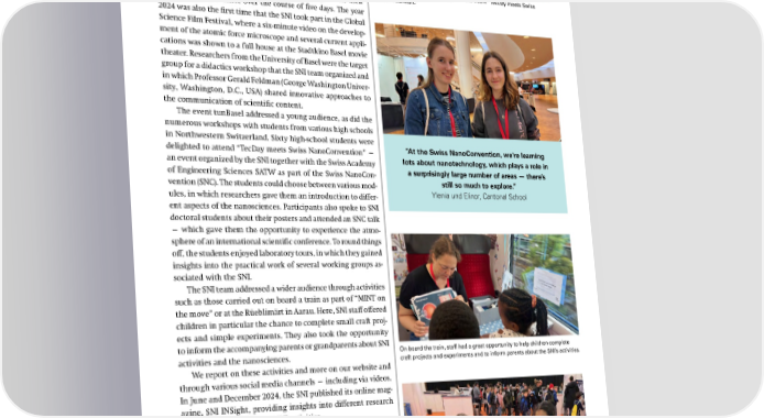 At the Rüeblimärt, in the lab, in the lecture room or online Different formats for different target groups In 2024, the SNI team once again used different platforms to engage with different target groups, inform them about the nanosciences, and generate interest in the natural sciences in general. At the start of the year, for example, there was a col- laboration with Volkshochschule beider Basel in which research- Sixty high-school students took part in the event “TecDay meets Swiss ers from the SNI network offered participants insights into their NanoConvention.” various fields of science over the course of five days. The year 2024 was also the first time that the SNI took part in the Global Science Film Festival, where a six-minute video on the develop- ment of the atomic force microscope and several current appli- cations was shown to a full house at the Stadtkino Basel movie theater. Researchers from the University of Basel were the target group for a didactics workshop that the SNI team organized and in which Professor Gerald Feldman (George Washington Univer- sity, Washington, D.C., USA) shared innovative approaches to the communication of scientific content. The event tunBasel addressed a young audience, as did the numerous workshops with students from various high schools in Northwestern Switzerland. Sixty high-school students were delighted to attend “TecDay meets Swiss NanoConvention” — “At the Swiss NanoConvention, we’re learning an event organized by the SNI together with the Swiss Academy lots about nanotechnology, which plays a role in of Engineering Sciences SATW as part of the Swiss NanoCon- a surprisingly large number of areas — there’s vention (SNC). The students could choose between various mod- still so much to explore.” ules, in which researchers gave them an introduction to differ- Ylenia und Elinor, Cantonal School ent aspects of the nanosciences. Participants also spoke to SNI doctoral students about their posters and attended an SNC talk — which gave them the opportunity to experience the atmo- sphere of an international scientific conference. To round things off, the students enjoyed laboratory tours, in which they gained insights into the practical work of several working groups as- sociated with the SNI. The SNI team addressed a wider audience through activities such as those carried out on board a train as part of “MINT on the move” or at the Rüeblimärt in Aarau. Here, SNI staff offered children in particular the chance to complete small craft proj- ects and simple experiments. They also took the opportunity to inform the accompanying parents or grandparents about SNI activities and the nanosciences. On board the train, staff had a great opportunity to help children complete craft projects and experiments and to inform parents about the SNI’s activities. We report on these activities and more on our website and through various social media channels — including via videos. In June and December 2024, the SNI published its online mag- azine, SNI INSight, providing insights into different research topics and an overview of SNI activities. Further information: YouTube channel: https://bit.ly/3u9XLjv LinkedIn: https://bit.ly/3rbYP4s Bluesky: https://bsky.app/profile/sniunibas.bsky.social SNI webpage: www.nanoscience.ch SNI INSight: https://bit.ly/4jWHcis Experiments and projects: https://bit.ly/40Uw0Kr tunBasel is always a great opportunity to reach numerous children and young people, to help them perform experiments, and to show them how exciting the natural sciences can be. SNI Annual Report 2024 65