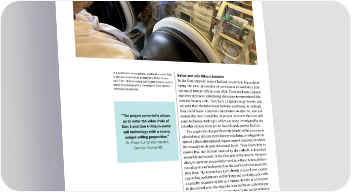 In a protected atmosphere, doctoral student Rob- Better and safer lithium batteries in Wullich assembles prototypes of the “reser- In the Nano-Argovia project BatCoat, researchers began devel- voir-free” lithium metal solid-state battery cells in order to subsequently investigate their electro- oping the next generation of zero-excess all-solid-state lithi- chemical properties. um-metal battery cells in early 2024. These solid-state Li-metal batteries represent a promising alternative to conventional lith- ium-ion battery cells. They have a higher energy density and are safer than the lithium-ion batteries used today. Accordingly, they could make a decisive contribution to effective, safe and “The project potentially allows sustainable electromobility. At present, however, there are still us to enter the value chain of some technical challenges, which are being investigated by the Gen 3 and Gen 4 lithium-metal interdisciplinary team in the Nano-Argovia project BatCoat. cell technology with a strong The negatively charged electrode (anode) of the zero-excess unique selling proposition.” all-solid-state lithium-metal battery cells being investigated con- Dr. Phani Kumar Yalamanchili, sists of a three-dimensional copper current collector, on which Oerlikon Metco AG the researchers deposit functional layers. These layers help to ensure that the lithium emitted by the cathode is deposited reversibly and evenly. In the first year of the project, the inter- disciplinary team successfully tested how these nanoscale func- tional layers can be deposited on the anode and what properties they have. The researchers have already achieved very promis- ing cycling performance of 200 charge and discharge cycles with 2 a capacity retention of 80% at a current density of 0.5 mA/cm . In the second year, the objective is to double or triple that per- formance in order to make it attractive for the battery industry. Collaboration between: Paul Scherrer Institute PSI // FHNW School of Engineering and Environment // Oerlikon Metco AG (Wohlen, AG) Project description: https://bit.ly/3CM6sqR SNI Annual Report 2024 37
