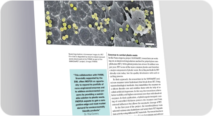 1 µm Scanning electron microscope image of a PET Enzymes to combat plastic waste film that is degraded by enzyme-based nanocat- In the Nano-Argovia project NANOdePET, researchers are work- alysts developed at the FHNW as part of the ing on an improved degradation method for polyethylene tere- NANOdePET project. (Image: FHNW) phthalate (PET). With global production of over 55 million tons per year, PET is one of the most common plastics and therefore a major component of plastic waste. Recycling methods for PET “This collaboration with FHNW, already exist today, but the quality deteriorates with each re- financially supported by the cycling process. SNI, offers INOFEA an opportu- In their approach, the researchers in the NANOdePET proj- nity to expand its portfolio of ect use enzymes (ester hydrolases) that break down PET. Using nano-engineered enzymes and nanotechnological methods, they immobilize the enzymes on to address environmental con- a silicon dioxide core and stabilize them with the help of so- cerns by providing a sustain- called artificial chaperones. In this way, the researchers achieve able solution to plastic waste. better stability and higher conversion rates than with dissolved INOFEA expects to gain a com- enzymes. In their application, a hybrid organic-inorganic coat- petitive edge and meet market ing of controlled thickness protects the enzymes used from demand for environmentally external influences but allows the enzymatic cleavage of PET. friendly products.” In the first year of the project, the interdisciplinary team Dr. Rita Correro, selected various ester hydrolases and tested their PET degrada- INOFEA AG tion activity using different PET materials. The researchers have optimized the conditions for efÏcient degradation and will now compare the method they have developed with current recy- cling methods and investigate the method’s suitability on an industrial scale. Collaboration between: FHNW School of Life Sciences // FHNW School of Engineering and Environment // INOFEA AG (Muttenz, BL) Project description: https://bit.ly/4gGXB7E SNI Annual Report 2024 39