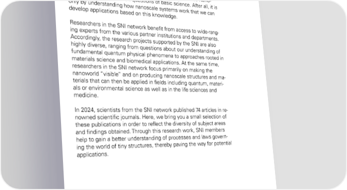Research: Founded on basic science A large part of research activities supported by the Swiss Nano- science Institute focus on questions of basic science. After all, it is only by understanding how nanoscale systems work that we can develop applications based on this knowledge. Researchers in the SNI network benefit from access to wide-rang- ing experts from the various partner institutions and departments. Accordingly, the research projects supported by the SNI are also highly diverse, ranging from questions about our understanding of fundamental quantum physical phenomena to approaches rooted in materials science and biomedical applications. At the same time, researchers in the SNI network focus primarily on making the nanoworld “visible” and on producing nanoscale structures and ma- terials that can then be applied in fields including quantum, materi- als or environmental science as well as in the life sciences and medicine. - In 2024, scientists from the SNI network published 74 articles in re nowned scientific journals. Here, we bring you a small selection of these publications in order to reflect the diversity of subject areas and findings obtained. Through this research work, SNI members help to gain a better understanding of processes and laws govern - ing the world of tiny structures, thereby paving the way for potential applications . 24 SNI Annual Report 2024