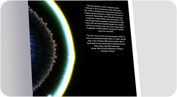 A fascinating world of tiny structures They say a picture is worth a thousand words — although, in the nanosciences, it often takes quite a few words to describe what exactly we’re looking at in images showing structures or objects from the micro or nanoworld. Nevertheless, these beautiful microscopic images are a never-ending source of fascination. The Nano Image Award competition advertised by the SNI means that we receive beautiful images from research- ers from our network every year. These images help us to appeal to a wider audience and generate curiosity about the nanoworld. This “eye” was one of the winning images in 2024 and shows an unexpected circular defect on a silicon dioxide chip. It was noticed by SNI doctoral student Jibin N. Sunil while he was examining two-dimensional mono- layers using a dark-field microscope. (Image: Jibin N. Sunil, Department of Physics, University of Basel) SNI Annual Report 2024 59
