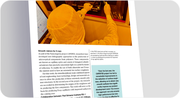 Fototermin 20.1. Smooth mirrors for X-rays In the PICO cleanroom at Park Innovaare, re- As part of the Nano-Argovia project CAPOFOX, researchers have searchers in the Nano-Argovia project CAPOFOX developed new lithographic approaches to the production of are processing light-sensitive coatings on wafers in order to subsequently produce the improved micro-optical components from polymers. These components X-ray capillary optics. are known as capillary optics and consist of elongated cylindri- cal mirrors that precisely concentrate light on a point by means of reflection. To enable the use of both ultraviolet and X-rays, the mirrors need to have an extremely low surface roughness. “Over the last year, the For this work, the interdisciplinary team combined aspects CAPOFOX project has led to of tool engineering, laser technology, design and materials sci- remarkable improvements in ence to allow the production of these extremely smooth poly- the reduction of surface rough- mer structures. In the second year of the project, the research- ness, allowing us to obtain very ers succeeded in determining the origins of the roughness and smooth surfaces that signifi- in producing the first components. This work will serve as the cantly improve our product basis for producing X-ray capillaries with improved surfaces in development work. This innova- the coming year. tive approach not only ensures Collaboration between: Paul Scherrer Institute PSI // high performance but also FHNW School of Life Sciences // XRnanotech AG (Villigen, opens the door to effective fu- AG) ture applications. We’re Project description: https://bit.ly/3ThvoMr delighted to play a part in such transformative improvements.” Dr. Florian Döring, XRnanotech AG 42 SNI Annual Report 2024