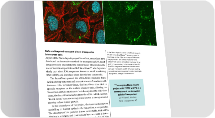 Safe and targeted transport of new therapeutics In the Nano-Argovia project SmartCoat, research- into cancer cells ers are using SmartCoats™ (shown in green in As part of the Nano-Argovia project SmartCoat, researchers have the image on the right) to transport RNA-based drugs precisely and safely into cancer cells developed an innovative method for transporting RNA-based (shown with a blue-colored cell nucleus and red drugs precisely and safely into tumor tissue. This involves the actin in the cytoplasm in the image on the left). use of novel nanoparticles called SmartCoats™, which protec- The RNA fragments introduced into the tumor cells are intended to switch-off cancer-causing tively coat short RNA sequences known as small interfering genes known as oncogenes, thereby reducing tu- RNA (siRNA) and introduce them directly into cancer cells. mor growth. (Image: FHNW Muttenz) The SmartCoats protect the siRNA from enzymatic degra- dation during transport and prevent unwanted reactions with immune cells. In tumor tissue, the SmartCoats then bind to “The ongoing Nano-Argovia specific receptors on the surface of cancer cells, allowing the project with FHNW and PSI is a SmartCoat-siRNA complexes to be taken up into the cells. Once cornerstone of our innovation there, the SmartCoat detaches from the siRNA, which can then at Palto Therapeutics.” “knock down” cancer-causing genes known as oncogenes and Dr. William L. Wishart, thereby reduce tumor growth. Palto Therapeutics AG In the second year of the project, the team used computer modelling to further optimize the SmartCoat nanoparticles. The structure of the particles is now more stable, their siRNA binding is stronger, and their uptake by cancer cells is better. Further studies can now follow under the leadership of Palto Therapeutics AG with a view to optimizing the effect of the particles on tumor growth, enabling precise and personalized treatment of life-threatening diseases such as cancer. Collaboration between: FHNW School of Life Sciences // Paul Scherrer Institute PSI // Palto Therapeutics AG (Allschwil, BL) Project description: https://bit.ly/4bR9s1Z 40 SNI Annual Report 2024