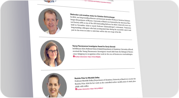Awards and honors Christoph Gerber named Clarivate Citation Laureate This year, our honorary member Professor Christoph Gerber (Department of Physics, University of Basel) was named a Clarivate Citation Laureate for the invention of the atomic force microscope. Every September, the media group Clarivate (UK) publishes a list of scientists who are considered potential future winners of a Nobel Prize due to fre- quent citations of their work in high-ranking scientific journals. Further information: https://clarivate.com/citation-laureates/winners/ Distinction and emeritus status for Christian Schönenberger In 2024, our long-standing director and honorary member Professor Christian Schönen- berger (Department of Physics, University of Basel) was honored by the American Phys- ical Society (APS) as one of the APS Outstanding Referees for 2024. A farewell event was held in November 2024 to mark Professor Schönenberger’s retirement. Numerous long-standing colleagues who had accompanied him during his successful career took part in the event in order to wish him well in this new stage of his life. Young Fluorescence Investigator Award for Sonja Schmid In February 2024, Professor Sonja Schmid (Department of Chemistry, University of Basel) received the Young Fluorescence Investigator Award 2024 from the Biological Fluores- cence Subgroup in recognition of her work in the area of fluorescence methodologies. Further information: https://bit.ly/40pIg5q Ruzicka Prize for Murielle Delley Professor Murielle Delley (Department of Chemistry, University of Basel) is to receive the Ruzicka Prize 2024 for her work on the controlled surface modification of cobalt phos- phide with sulfur. Further information: https://bit.ly/4iBSmrf Wide-ranging grants for new research projects In 2024, SNI members were again very successful at attracting grants from national and international sources. We’ve been reporting on the various new research projects in our online magazine, SNI INSight, since 2024 in order to encourage exchange within the network. Grants for new research projects in the first half of the year: https://bit.ly/4gTZ3E5 Grants for new research projects in the second half of the year: https://bit.ly/40U4dtK SNI Annual Report 2024 63