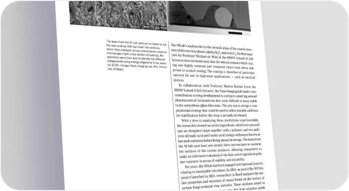 The team from the NI Lab used an ion beam to cut The NI Lab’s analyses led to the identification of the crystal struc- the new coating (left: top view) into sections, ture of the two key phases (alpha-Al O and m-ZrO ). Further anal- which they analyzed using a transmission electron 2 3 2 microscope (right: cross section of coating). Re- yses by Professor Michael de Wild at the FHNW School of Life searchers were then able to identify the different Sciences then demonstrated that the 400-micrometer-thick coat- components using energy-dispersive X-ray analy- ing was highly resistant and remained intact even when sub- sis (EDX). (Image: Nano Imaging Lab, SNI, Univer- jected to scratch testing. The coating is therefore of particular sity of Basel) interest for use in high-wear applications — such as medical devices. In collaboration with Professor Martin Kuentz from the FHNW School of Life Sciences, the Nano Imaging Lab made a key contribution to drug development in a project centering around pharmaceutical formulations that were difÏcult to keep stable in the amorphous (glass-like) state. The aim was to design a com- putational strategy that could be used to select suitable additives for stabilization before the drug is actually developed. With a view to analyzing these predictions experimentally, the researchers tested two active ingredients, which were pressed into an elongated shape together with a polymer and two addi- tives (dl-malic acid and l-acetic acid) using a technique known as hot-melt extrusion before being placed in storage. The team from the NI Lab used laser and atomic force microscopes to examine the surfaces of the various products, allowing researchers to make an informed evaluation of the best active ingredient-poly- mer mixtures in terms of stability and durability. For years, the NI Lab has been engaged in trinational projects relating to sustainable viticulture. In 2024, as part of the WiVitis project launched in 2023, researchers in Basel analyzed the sur- face properties and structure of waxes found on the berries of certain fungi-resistant vine varieties. These analyses aimed to further the development of concepts that help wineries tackle the challenges of climate change. The instruments used at the NI Lab must be continuously renewed and expanded with a view to not only constantly im- proving the lab’s services and its own research but also adapting the infrastructure in line with demand. In 2024, the NI Lab team installed and commissioned a new scanning electron microscope (Zeiss FIB-SEM Crossbeam 540), which is equipped with a focused 52 SNI Annual Report 2024