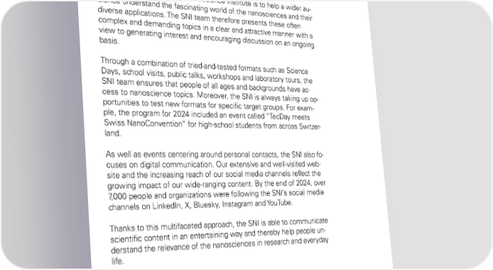 Communication and outreach: Promotion of dialog between research and society One key task of the Swiss Nanoscience Institute is to help a wider au- dience understand the fascinating world of the nanosciences and their diverse applications. The SNI team therefore presents these often complex and demanding topics in a clear and attractive manner with a view to generating interest and encouraging discussion on an ongoing basis. Through a combination of tried-and-tested formats such as Science Days, school visits, public talks, workshops and laboratory tours, the SNI team ensures that people of all ages and backgrounds have ac- cess to nanoscience topics. Moreover, the SNI is always taking up op- portunities to test new formats for specific target groups. For exam- ple, the program for 2024 included an event called “TecDay meets Swiss NanoConvention” for high-school students from across Switzer - land. As well as events centering around personal contacts, the SNI also fo- cuses on digital communication. Our extensive and well-visited web- site and the increasing reach of our social media channels reflect the growing impact of our wide-ranging content. By the end of 2024, over 7,000 people and organizations were following the SNI’s social media channels on LinkedIn, X, Bluesky, Instagram and YouTube. Thanks to this multifaceted approach, the SNI is able to communicate scientific content in an entertaining way and thereby help people un - derstand the relevance of the nanosciences in research and everyday life. 64 SNI Annual Report 2024