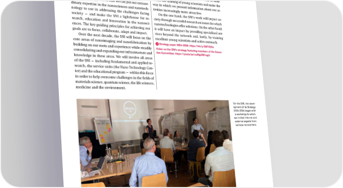 Strategy 2024–2034 Close collaboration by all partners is vital for the Geared toward a successful success of an interdisciplinary network such as the shared future SNI. The aim for the future is to strengthen identifi- cation with the SNI network among its members, to create a stronger sense of “we” and to communicate At the end of May 2024, the Argovia Committee ap- the SNI’s achievements together. proved the strategy paper for 2024–2034. It was de- In order to compete with the best nanoscience veloped with the involvement of the SNI manage- centers in the world, we must adapt our infrastruc- ment, external and internal experts, and members ture to the ever-increasing technological demands of the SNI Executive Committee. Using this strategy of the coming years. We will also continue to mod- as a guide, the SNI will position and establish itself ernize the training of young scientists and make the over the coming years so that we can put our extraor- way in which we present information about our ac- dinary expertise in the nanosciences and nanotech- tivities increasingly more attractive. nology to use in addressing the challenges facing On the one hand, the SNI’s work will impact so- society — and make the SNI a lighthouse for re- ciety through successful research on issues for which search, education and innovation in the nanosci- nanotechnologies offer solutions. On the other hand, ences. The key guiding principles for achieving our it will have an impact by providing specialized ser- goals are to focus, collaborate, adapt and impact. vices beyond the network and, lastly, by training Over the next decade, the SNI will focus on the excellent young scientists and active outreach. core areas of nanoimaging and nanofabrication by Strategy paper 2024–2034: https://bit.ly/3WY3Dts building on our roots and experience while steadily Video on the SNI’s strategy featuring members of the Execu- consolidating and expanding our infrastructure and tive Committee: https://youtu.be/ooINp3M1ngU knowledge in these areas. We will involve all areas of the SNI — including fundamental and applied re- search, the service units (the Nano Technology Cen- ter) and the educational program — within this focus in order to help overcome challenges in the fields of materials science, quantum science, the life sciences, medicine and the environment. For the SNI, the devel- opment of its Strategy 2024–2034 began with a workshop to which we invited internal and external experts from various nanocenters. SNI Annual Report 2024 61
