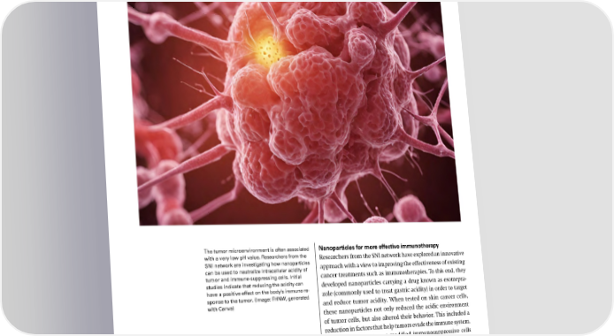 The tumor microenvironment is often associated Nanoparticles for more effective immunotherapy with a very low pH value. Researchers from the Researchers from the SNI network have explored an innovative SNI network are investigating how nanoparticles approach with a view to improving the effectiveness of existing can be used to neutralize intracellular acidity of tumor and immune-suppressing cells. Initial cancer treatments such as immunotherapies. To this end, they studies indicate that reducing the acidity can developed nanoparticles carrying a drug known as esomepra- have a positive effect on the body’s immune re- zole (commonly used to treat gastric acidity) in order to target sponse to the tumor. (Image: FHNW, generated with Canva) and reduce tumor acidity. When tested on skin cancer cells, these nanoparticles not only reduced the acidic environment of tumor cells, but also altered their behavior. This included a reduction in factors that help tumors evade the immune system. Moreover, the treatment modified immunosuppressive cells from patients in a way that boosted their ability to support the body’s natural immune response against cancer. Original publication: https://doi.org/10.1016/j.isci.2024.111559 SNI Annual Report 2024 29