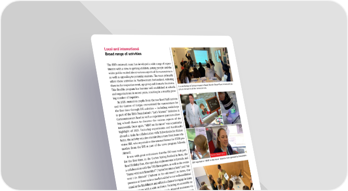 In a workshop at Cartoonmuseum Basel, Kerstin Beyer-Hans introduced pu- pils to the world of the nanosciences. Local and international Broad range of activities The SNI’s outreach team has developed a wide range of exper- iments with a view to getting children, young people and the wider public excited about various aspects of the nanosciences as well as appealing to potential students. The team primarily offers these activities in Northwestern Switzerland, tailoring them to the respective event, age group and thematic focal area. This flexible program has become well established at schools and organizations in recent years, resulting in a steadily grow- ing number of inquiries. In 2025, numerous pupils from the two Basel half-cantons and the Canton of Aargau encountered the nanosciences for the first time through SNI activities — including workshops as part of the IBSA Foundation’s “Let’s Science” initiative at Cartoonmuseum Basel as well as experiment parcours allow- ing school classes to discover the various aspects of the nanoworld. Once again, “MINT on the move” was a particular highlight of 2025. Featuring experiments and handicrafts aboard a train in collaboration with Schweizerische Südost- bahn, the activity was also attended by a team from Swiss tele- vision SRF, who reported on this unusual format for STEM pro- motion from the SNI as part of the news program Schweiz Aktuell. It was with great enthusiasm that the SNI team took part, for the first time, in the Gurten Spring Festival in Bern, the Basel Holiday Pass, the open day at phaenovum in Lörrach, and a collaboration with the VHS Bremgarten, as well as the events “Aarau wird zum Bauernhof” (“Aarau becomes a farm”) and “Ad- vent i de Altstadt” (“Advent in the old town”) in Aarau. Our presence at these various markets added to our well-established stand at the Rüeblimärt and offered a chance to engage in many conversations with a wide audience. Focusing on accessible ex- periments and handicrafts, the stands attracted numerous vis- itors — and the SNI team also brought many of these experi- ments together on its three new social media channels by the name of “Nano.Neugier” in 2025. On Instagram, TikTok and YouTube, Dr. Kerstin Beyer-Hans published new ideas for creative activities on a weekly basis, helping to boost the SNI’s visibility. The SNI principally engages with potential students at stu- dent fairs, which the Study Coordination team attends regu- larly, as well as through advertisements and the “Schnupper School“ of the University of Basel. In addition, numerous nano- science students visited their former schools to talk about their personal experiences of this demanding degree program. When communicating research findings, the SNI follows a broad-based approach and sets its sights on an international audience. Via social media, the SNI regularly posts short articles on the excellent research supported by the SNI and thereby reaches a growing academic readership. In addition, the twice- yearly online magazine “SNI INSight” provides information aimed at the SNI network. Further informationen: SNI website: https://nanoscience.unibas.ch/en/ LinkedIn: https://bit.ly/3rbYP4s YouTube: https://bit.ly/4q9V1Mh + https://bit.ly/3NPKXdN SNI INSight: https://bit.ly/4cJUn52 At the Future Day, Battist Utinger explained to an interested audience how colors can be produced by different structures. On visits to the SNI, pupils make various stops to learn about different as- pects of the nanosciences. SRF reported on “MINT on the move” aboard a train operated by Südostbahn. Kerstin Beyer-Hans 67 SNI Annual Report 2025