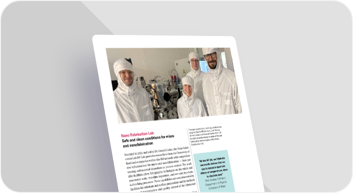 Nano Fabrication Lab Safe and clean conditions for micro and nanofabrication Founded in 2022 and led by Dr. Gerard Gadea, the Nano Fabri- cation Lab (NF Lab) provides researchers from the University of Basel and companies within the SNI network with comprehen- sive infrastructure for micro and nanofabrication — from pat- terning and material deposition to process control. The avail- able facilities allow lithographic techniques on the micro and nanometer scale, thin-film deposition, and wet and dry chem- ical etching processes. These capabilities are complemented by facilities for substrate and surface preparation and by methods for the characterization and quality control of the fabricated structures. The extensive pool of equipment and the NF Lab’s two clean rooms are primarily used by master’s students, doctoral stu- dents, postdocs and several scientists from companies within the SNI network. The NF Lab’s four-person team manages instruments and in- frastructure, enabling trained users to carry out their projects independently. It also ensures that all users can conduct their work safely and efficiently, regardless of the diversity of projects. The team’s responsibilities include providing training on the different instruments, procuring, installing, maintaining and repairing equipment, providing consumables, and monitoring compliance with safety and cleanliness requirements. In 2025, the team introduced new guidelines for the use of clothing and materials in order to further improve conditions in the clean rooms — making work safer, more efficient and cleaner for ev- eryone involved. Expanding the equipment pool It is also a priority for NF Lab head Gerard Gadea to continuously improve the laboratory’s equipment and respond to the needs of research groups that rely on its facilities. “At the NF lab, we fabricate nanoscale devices that we use to measure quantum effects at temperatures close to absolute zero.” Prof. Andrea Hofmann, Department of Physics, University of Basel Through supervision, training and technical support, Xavier Wildermuth, Juri Herzog, Arnold Lücke and Gerard Gadea (from left to right) provide access to state-of-the-art fabrication technologies at the Nano Fabrication Lab. “We use the new electron beam lithography machine (EBPG) of the NF Lab to fabricate electrical gates within 10nm to semiconduct- ing nanowires to form quan- tum bits, with a precision and reproducibility that was not possible on the older machines.” Dr. Andreas Baumgartner, Department of Physics, University of Basel 57 SNI Annual Report 2025