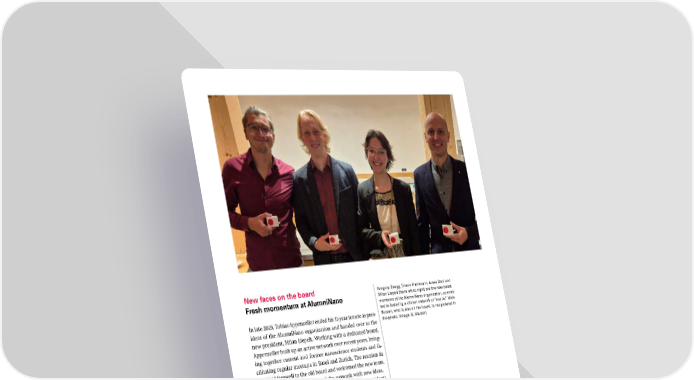 New faces on the board Fresh momentum at AlumniNano In late 2025, Tobias Appenzeller ended his 11-year tenure as pres- ident of the AlumniNano organization and handed over to the new president, Milan Liepelt. Working with a dedicated board, Appenzeller built up an active network over recent years, bring- ing together current and former nanoscience students and fa- cilitating regular meetups in Basel and Zurich. The reunion in 2025 bid farewell to the old board and welcomed the new team, which is keen to further expand the network with new ideas. The young team, consisting of Milan Liepelt (president), Alexa Dani and Timon Flathmann (communication), Gregory Zaugg (events) and Niels Burzan (finances), combines experience in quantum computing, medtech, nano drug delivery and phar- maceutical analytics, as well as risk management and venture capital. With fresh energy, the board aims to further strengthen links between students, alumni and the SNI. AlumniNano is to enjoy greater visibility — for example, at the general assembly of the nano student association, the master’s degree ceremony or at informal get-togethers. There are also plans to provide greater support for lunchtime lectures and, in the long term, to build up a mentoring program. For all alumni, the team is planning additional events, a more active LinkedIn group and initiatives to incorporate additional members. Moreover, the aim is to collaborate with other alumni groups and companies in order to promote dialog and new career opportunities. SNI INSight article on the new board: https://bit.ly/4rOzgTK Brochure with brief portraits of various career pathways of nanoscience graduates (in German): https://bit.ly/3XZ7hUe Gregory Zaugg, Timon Flathmann, Alexa Dani and Milan Liepelt (from left to right) are the new board members of the AlumniNano organization, commit- ted to fostering a vibrant network of “nanos. ” Niels Burzan, who is also on the board, is not pictured in the photo. (Image: S. Stalder) 15 SNI Annual Report 2025