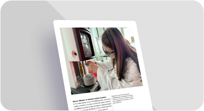 Electron diffraction for structural analysis of proteins In the Nano-Argovia project ProtEDinNanoxtals, researchers sought to establish a complete workflow for analyses with elec- tron diffraction and to use the technique in a targeted manner to investigate the role of hydrogen atoms in protein-ligand in- teractions — for both soluble and membrane proteins. To this end, the team led by Dr. Valérie Panneels (PSI) took measurements both with a conventional electron microscope and with an electron diffractometer specifically designed for electron diffraction. In their investigations, the researchers suc- ceeded for the first time in determining protein structures from nanocrystals with a resolution down to 2.1 Å. The team also established a method based on a focused ion beam (FIB) for cutting thick crystals into analyzable thin sheets — resulting in usable structural data even starting from thicker crystals. Overall, the results show that electron diffraction can also be used reliably for the structural determination of proteins, paving the way for numerous future applications. Collaboration between: Paul Scherrer Institute PSI // Biozentrum, University of Basel // leadXpro AG (Villigen) // ELDICO Scientific AG (Allschwil) Publication: https://doi.org/10.1016/j.bpj.2025.10.027 Project description: https://bit.ly/4kWSfcl Researchers in the Nano-Argovia project ProtEDinNanoxtals have established a complete workflow for using electron diffraction to specifi- cally investigate the role of hydrogen in protein- ligand interactions. 48 SNI Annual Report 2025
