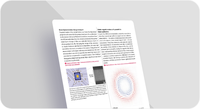 Stable magnetic vortices with potential for future applications As part of an SNI doctoral dissertation, researchers were able to show that a special rare earth ferromagnet can form stable sky- rmion bubbles — tiny vortices in the magnetization that persist even in the absence of an external magnetic field — at room temperature. Using X-ray microscopy and nanoscale magnetic field measurements, the researchers were able to demonstrate the stability of these bubbles and observed that they could be deformed and recovered by varying the magnetic field. Simula- tions confirmed this behavior and showed that certain complex magnetic interactions are not required to generate the bubbles – contrary to previous expectations. Published in the journal Scientific Reports, the findings underline the robustness of skyrmions and their potential for future applications in spin- tronics. Original publication: https://www.nature.com/articles/s41598-024-82114-2 Strained Ge QW 2 nm Germanium is explored as a promising semiconductor for quantum applica- tions due to various factors. The performance of the components can be im- proved by changing the strain of heterostructures. Here we show a scheme of a quantum component (left) and an atomic-resolution scanning transmis- sion electron microscopy image (right) that confirms single-crystal, high- quality layers with atomically sharp interfaces. (Image: A. Nigro, Department of Physics, University of Basel) Strain leads to better charge transport Targeted strain of the crystal lattice can boost the functional properties of extremely thin germanium layers. In a publication in the journal Advanced Materials Interfaces, researchers from the SNI network show how the strain in extremely thin germa- nium layers changes if they are embedded between layers of silicon-germanium. By changing the design of the structure, i.e. layers thickness and chemical composition, the team engi- neered the electronic properties of the system. Using advanced measurement techniques and computer simulations, the team of researchers was able to quantify how much the layers were stretched or compressed in a targeted manner. These findings bring germanium-based quantum chips a significant step closer to practical applications. Original publication: https://advanced.onlinelibrary.wiley.com/doi/ full/10.1002/admi.202500620 Skyrmion bubbles of this kind can be deformed and recovered by varying the magnetic field. (Image: S. Treves, former SNI PhD student, Department of Physics and SNI, University of Basel) 34 SNI Annual Report 2025