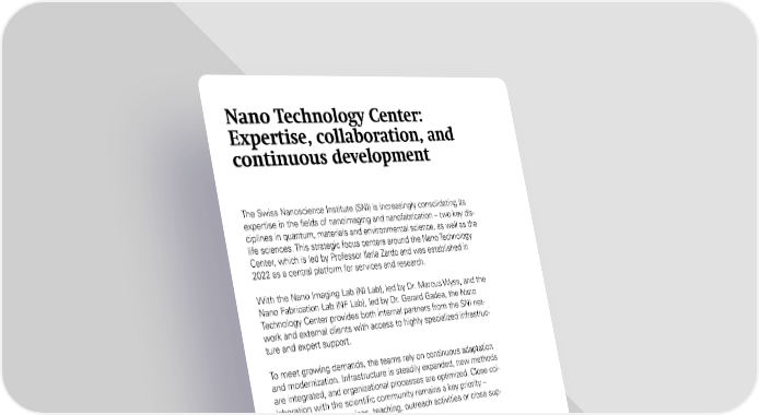 The Swiss Nanoscience Institute (SNI) is increasingly consolidating its expertise in the fields of nanoimaging and nanofabrication – two key dis- ciplines in quantum, materials and environmental science, as well as the life sciences. This strategic focus centers around the Nano Technology Center, which is led by Professor Ilaria Zardo and was established in 2022 as a central platform for services and research. With the Nano Imaging Lab (NI Lab), led by Dr. Marcus Wyss, and the Nano Fabrication Lab (NF Lab), led by Dr. Gerard Gadea, the Nano Technology Center provides both internal partners from the SNI net- work and external clients with access to highly specialized infrastruc- ture and expert support. To meet growing demands, the teams rely on continuous adaptation and modernization. Infrastructure is steadily expanded, new methods are integrated, and organizational processes are optimized. Close col- laboration with the scientific community remains a key priority – whether through services, teaching, outreach activities or close sup- port for research projects. The Nano Imaging Lab handled a total of 200 assignments from 140 clients in 2025. Approximately 85% came from the SNI network, nearly 10% involved collaborations with industry (Bruker Nano Surface, Artidis AG, DeltaMem AG, SenTec AG, Solvias AG), and around 5% originated from research institutions outside the SNI network. In 2025, 76 different users availed themselves of the Nano Fabrication Lab’s infrastructure. These users came from 13 different research groups – 10 from the Department of Physics, two from the Depart- ment of Chemistry and one from the Biozentrum. In addition, there were also researchers from two startups working at the NF Lab. Nano Technology Center: https://nanoscience.unibas.ch/en/services/ Nano Technology Center: Expertise, collaboration, and continuous development 52 SNI Annual Report 2025