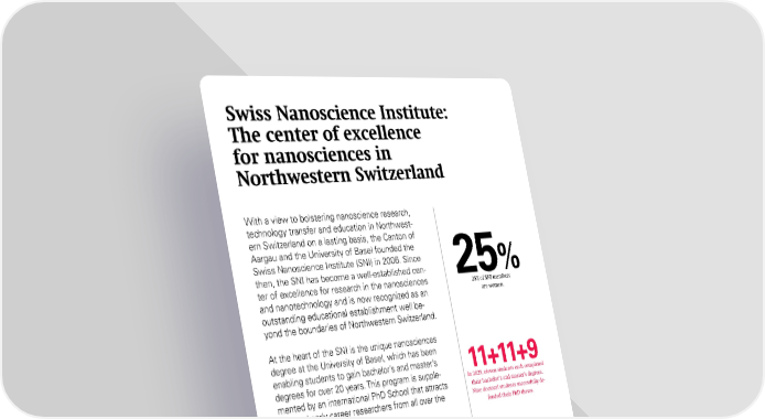 25 % 25% of SNI members are women. 11+11+9 In 2025, eleven students each completed their bachelor’s and master’s degrees. Nine doctoral students successfully de- fended their PhD theses. 41 In 2025, 41 doctoral students were enrolled in the SNI PhD School. Swiss Nanoscience Institute: The center of excellence for nanosciences in Northwestern Switzerland With a view to bolstering nanoscience research, technology transfer and education in Northwest- ern Switzerland on a lasting basis, the Canton of Aargau and the University of Basel founded the Swiss Nanoscience Institute (SNI) in 2006. Since then, the SNI has become a well-established cen- ter of excellence for research in the nanosciences and nanotechnology and is now recognized as an outstanding educational establishment well be- yond the boundaries of Northwestern Switzerland. At the heart of the SNI is the unique nanosciences degree at the University of Basel, which has been enabling students to gain bachelor’s and master’s degrees for over 20 years. This program is supple- mented by an international PhD School that attracts talented early career researchers from all over the world. Researchers in the SNI network come from various academic institutions in Northwestern Switzerland and work on projects geared toward basic research as well as applied projects in collaboration with in- dustry – from the life sciences to quantum, material and environmental science, with a particular focus on nanoimaging and nanofabrication. Research and teaching are supported by the Nano Technology Center, which – with its Nano Imaging Lab and Nano Fabrication Lab – offers extensive ex- pertise in imaging, surface analysis and micro and nanofabrication as well as access to state-of-the-art infrastructure. 6 SNI Annual Report 2025