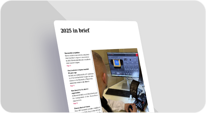 With new equipment, the teams at the Nano Technology Center are expanding their range of possible applications— here with a new 3D microscope in the Nano Fabrication Lab. 2025 in brief Successful completion Eleven students successfully completed their bachelor’s degree in nanoscience in 2025. Eleven students also completed their master’s degree. Page 12 First bachelor ’ s degree awarded 20 years ago In 2025, we celebrated the 20 th anniversa- ry of the first bachelor’s degree in nano- science at the University of Basel with numerous students and alumni. Page 13 New board for the alumni organization At the end of 2025, a new board took over the management of the AlumniNano organization. Page 15 Diverse doctoral theses Nine SNI doctoral students completed their theses in 2025. They conducted their research at the University of Basel’s De- partments of Biozentrum, Chemistry and Physics, at the Paul Scherrer Institute PSI, and at the FHNW School of Life Sciences. Page 16 The path to founding a company In 2025, t he “From Lab to Startup” work- shop was once again a great success. Du- ring the workshop, doctoral students learned how to successfully present their own business ideas to investors. Page 21 Supportive network Doctoral students at the SNI PhD School ap- preciate the supportive, international and interdisciplinary community at the SNI. Page 20 Services and research The Nano Technology Center, with its two units Nano Imaging Lab and Nano Fabrication Lab, provides the SNI network with services in the field of nanoimaging and nanofabrication. In 2025, the two teams were able to expand their equipment and make significant contributions to numerous diverse research projects. Page 52 Networking events To ensure exchange within the interdisciplinary network with researchers from various academic institutions in Northwestern Switzerland, the SNI organized various events such as the Annual Meeting and the NanoTec Apéro. Page 63 4 SNI Annual Report 2025