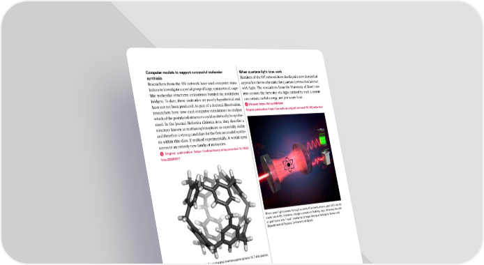 When quantum light does work Members of the SNI network have developed a new theoretical approach to thermodynamics for quantum systems that interact with light. The researchers from the University of Basel take into account the facts that the light emitted by such a system can contain useful energy, not just waste heat. SNI post: https://bit.ly/3MlHAek Original publication: https://journals.aps.org/prl/abstract/10.1103/zdbv-rksc When laser light passes through a cavity filled with atoms, part of it can do useful work (for instance, charge a quantum battery, top), whereas the oth- er part turns into “heat” (bottom). (Image: Enrique Sahagún, Scixel and Department of Physics, University of Basel) Computer models to support successful molecular synthesis Researchers from the SNI network have used computer simu- lations to investigate a special group of large, symmetrical, cage- like molecular structures (calixarenes bonded via methylene bridges). To date, these molecules are purely hypothetical and have not yet been produced. As part of a doctoral dissertation, researchers have now used computer simulations to analyze which of the postulated structures could realistically be synthe- sized. In the journal Helvetica Chimica Acta, they describe a structure known as methanospherophane as especially stable and therefore a strong candidate for the first successful synthe- sis within this class. If realized experimentally, it would open access to an entirely new family of molecules. Original publication: https://onlinelibrary.wiley.com/doi/10.1002/ hlca.202500177 Computational model of a postulated methanospherophane (K. Tiefenbacher, Department of Chemistry, University of Basel) 31 SNI Annual Report 2025