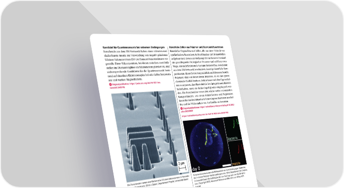 Kandidat für Quantensensorik bei extremen Bedingungen Künstliche Zellen aus Polymer und Biomolekülbausteinen Forschende aus dem SNI-Netzwerk haben einen robusten und Künstliche Organellen und Zellen, die aus einer Vielzahl von skalierbaren Ansatz zur Verwendung von negativ geladenen synthetischen Bausteinen in Kombination mit Biomolekülen Silizium-Vakanzzentrum (SiV-) in Diamant-Nanostrukturen vor- aufgebaut sind, dienen als Werkzeuge für ein besseres Verständ- gestellt. Diese Vakanzzentren, bei denen zwischen zwei Fehl- nis grundlegender biologischer Prozesse und erö昀昀nen neue stellen im Diamantengitter ein Siliziumatom platziert ist, sind Wege, um multifunktionale Systeme herzustellen. Forschende vielversprechende Kandidaten für die Quantensensorik basie- aus dem SNI-Netzwerk beschreiben derartige künstliche Kom- rend auf einzelnen Elektronenspins bei sehr tiefen Temperatu- partimente, deren Gerüst hauptsächlich aus Polymeren besteht. ren und starken Magnetfeldern. Polymere sind von besonderem Interesse, da sie eine grosse Originalpublikation: https://pubs.acs.org/doi/10.1021/acs. chemische Vielfalt besitzen. Zudem lassen sich ihre Eigenschaf- nanolett.3c03145 ten so anpassen, dass Biomoleküle ihre Integrität und Aktivität beibehalten, wenn sie darin eingefügt oder eingekapselt wer- den. Die Forschenden verwenden solche weiter entwickelten Kompartimente, um einen kontrollierten und begrenzten Raum für das Hochdurchsatz-Screening von Bakterien zu schaf- fen und die Wirksamkeit von Antibiotika zu bewerten. Originalpublikationen: https://onlinelibrary.wiley.com/doi/epdf/10.1002/ advs.202305837 https://onlinelibrary.wiley.com/doi/full/10.1002/advs.202307103 Die Forschenden betten ober昀氀ächennahe Silizium-Vakanzzentren in Nanosäu- Forschende untersuchen die Wirksamkeit von Antibiotika gegen Bakterien, len aus Diamant ein. (Bild: J. Zuber, Departement Physik, Universität Basel) die in einem Polymer-Vesikel gefangen sind. (Bild: Departement für Chemie, Universität Basel, Vervielfältigt unter den Bedingungen der CC-BY 4.0-Li- zenz. Copyright 2023. Advanced Science veröffentlicht von Wiley-VCH GmbH) Methode zur Ladungsmessung in Quantenpunkten Forschende aus dem SNI-Netzwerk haben einen Ansatz präsen- tiert, um die Ladungskon昀椀guration von Quantenpunkten zu untersuchen, die in Nanodrähten aus Germanium mit einem Siliziummantel gebildet werden. Sie verwenden dazu einen be- sonderen supraleitenden Resonator auf der Basis von Niob- Titannitrid und koppeln ihn mit einem doppelten Quanten- punkt in dem Germanium-Silizium-Nanodraht. Originalpublikation: https://iopscience.iop.org/artic le/10.1088/26334356/ace2a6 SNI-Jahresbericht 2023 31