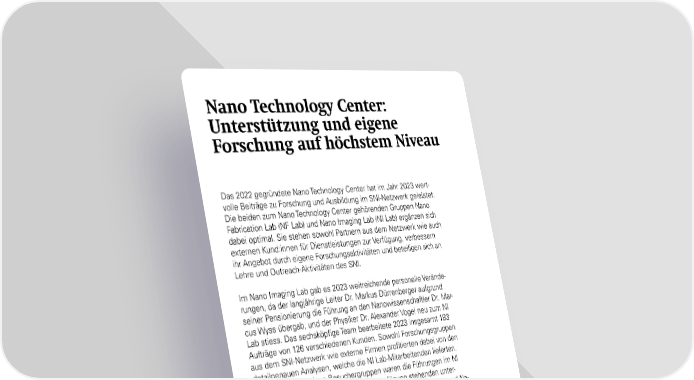 Nano Technology Center: Unterstützung und eigene Forschung auf höchstem Niveau Das 2022 gegründete Nano Technology Center hat im Jahr 2023 wert- volle Beiträge zu Forschung und Ausbildung im SNI-Netzwerk geleistet. Die beiden zum Nano Technology Center gehörenden Gruppen Nano Fabrication Lab (NF Lab) und Nano Imaging Lab (NI Lab) ergänzen sich dabei optimal. Sie stehen sowohl Partnern aus dem Netzwerk wie auch externen Kund:innen für Dienstleistungen zur Verfügung, verbessern ihr Angebot durch eigene Forschungsaktivitäten und beteiligen sich an Lehre und Outreach-Aktivitäten des SNI. Im Nano Imaging Lab gab es 2023 weitreichende personelle Verände- rungen, da der langjährige Leiter Dr. Markus Dürrenberger aufgrund seiner Pensionierung die Führung an den Nanowissenschaftler Dr. Mar- cus Wyss übergab, und der Physiker Dr. Alexander Vogel neu zum NI Lab stiess. Das sechsköp昀椀ge Team bearbeitete 2023 insgesamt 183 Aufträge von 126 verschiedenen Kunden. Sowohl Forschungsgruppen aus dem SNI-Netzwerk wie externe Firmen pro昀椀tierten dabei von den detailgenauen Analysen, welche die NI Lab-Mitarbeitenden lieferten. Auch für verschiedene Besuchergruppen waren die Führungen im NI Lab von grossem Interesse, da die zur Verfügung stehenden unter- schiedlichen Mikroskope faszinierende Abbildungen der Mikro- und Na- nowelt liefern und damit einen eindrucksvollen Einblick in die Welt der winzigen Strukturen und Objekte erlauben. Das Nano Fabrication Lab hat 2023 seine Arbeit fortgesetzt, die für Mi- kro- und Nanofabrikation notwendige Infrastruktur des Departement Physik zu bündeln, organisatorische Massnahmen zur Erhöhung der Ef- 昀椀zienz und Sicherheit im Reinraumbetrieb zu etablieren und die Wei- chen für die Erweiterung des Geräteparks und eines zweiten Rein- raums zu stellen. 2023 nutzten neun verschiedene Forschungsgruppen der Universität Basel mit insgesamt 80 Nutzer:innen die Dienstleistun- gen des NF Labs. Auch personell ist das NF Lab im Jahr 2023 deutlich gewachsen. Im November stiessen die beiden Techniker:innen Juri Herzog und Xavier Wildermuth zum dem nun vierköp昀椀gen Team des Nano Fabrication Labs. Nano Technology Center: https://nanoscience.unibas.ch/de/services/ 46 SNI-Jahresbericht 2023
