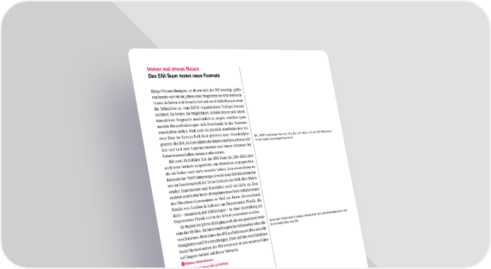 Immer mal etwas Neues Das SNITeam testet neue Formate Einige Veranstaltungen, an denen sich das SNI beteiligt, gehö- ren bereits seit vielen Jahren zum Programm des SNI-Outreach- Teams. So haben sich Besuche bei und von Schülerklassen sowie die Teilnahme an vom SATW organisierten TecDays bestens etabliert. Sie bieten die Möglichkeit, Schüler:innen mit einem interaktiven Programm anschaulich zu zeigen, welchen span- nenden Herausforderungen sich Forschende in den Nanowis- senschaften stellen. Und auch die jährlich statt昀椀ndenden Sci- ence Days im Europa Park Rust gehören zum «Standardpro- Bei „MINT unterwegs“ konnten alle, die Lust hatten, mit den SNI-Mitarbeite- gramm» des SNI, da hier zahlreiche Kinder und Erwachsene mit rinnen basteln und experimentieren. Zeit und Lust zum Experimentieren und einem Interesse für Naturwissenschaften zusammenkommen. Mit zwei Aktivitäten hat das SNI-Team im Jahr 2023 aber auch neue Formate ausprobiert, um Menschen anzusprechen, die wir bisher noch nicht erreicht haben. Zum einen boten im Rahmen von “MINT unterwegs» jeweils zwei SNI-Mitarbeiterin- nen im Familienabteil des Treno Gottardo der SOB allen Mitrei- senden Experimente und Basteleien rund um Licht an. Zum anderen zeichneten beim «Perspektivenwechsel» Schüler:innen des Oberrhein-Gymnasiums in Weil am Rhein (Deutschland) Details von Geräten in Laboren am Departement Physik, die dann – zusammen mit Erklärungen – in einer Ausstellung am Departement Physik und in der Schule präsentiert wurden. Zu Beginn des Jahres 2023 ging auch die neu gestaltete Web- seite des SNI live. Sie bietet umfangreiche Information über die Auch beim Rüeblimärt in Aarau interessierten sich zahlreiche Besucher:innen verschiedenen Aktivitäten des SNI und informiert über aktuelle für die Aktivitäten des SNI. Neuigkeiten und Veranstaltungen. Posts auf den verschiedenen Social Media-Kanälen des SNI verweisen in den meisten Fällen auf längere Artikel auf dieser Webseite. Weitere Informationen: YouTubeKanal: https://bit.ly/3u9XLjv LinkedIn: https://bit.ly/49qqa5z X: https://twitter.com/SNIunibas SNIWebseite: www.nanoscience.ch Experimente für zuhause: http://bit.ly/3Hw1FIk Videoserie über Frauen in den Nanowissenschaften: https://bit.ly/48NNHya Eine animierte Version des elektromischen Magazins «SNI INSight» soll das «Das Besondere beim Experimentieren im Zug war, Lesen der Neuigkeiten rund ums SNI attraktiver machen. dass die Leute wirklich Zeit hatten uns zuzuhören und sich über Nanowissenschaften zu informieren.» Dr. Kerstin Beyer-Hans, Outreach-Managerin am SNI und Initiatorin des Projekts «MINT unterwegs» Unsere Schüler:innen haben beim «Perspektiven wechsel» von der Verbindung mit der Wissenschaft pro昀椀tiert und dabei erfahren, dass die Welt der Kunst und die der Wissenschaft eine inspirierende Schnitt stelle haben können. Dr. Tanja Reinhardt-Albiez Studiendirektorin Oberrheingymnasium Weil am Rhein Eine Videoserie über «Frauen in den Nanowissenschaften» zeigt Beispiele verschiedener Karrieren in den Nanowissenschaften. SNI-Jahresbericht 2023 57