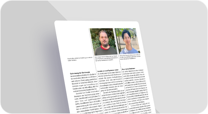 Claudio Alter erklärt die Herstellung von extrazel- David Jaeger hat seine Doktorarbeit am Departe- Toshiya Kozai hat seine Doktorarbeit am Biozent- lulären Partikeln. ment Physik der Universität Basel absolviert und rum der Universität Basel geschrieben und arbei- war dort als Postdoktorand angestellt. tet dort jetzt auch als Postdoktorand. Optimierung der Gentherapie Vorteile von zwei Systemen nutzen Dynamische Strukturen In seiner Doktorarbeit hat Dr. Claudio Al- Dr. David Jaeger hat in seiner Doktorar- Dr. Toshiya Kozai hat in seiner Doktorar- ter verschiedene Methoden zur e昀昀ektiven beit eine optomechanische Plattform ent- beit Kernporenkomplexe genauer unter- und sicheren Übertragung genetischen wickelt. Die erzielte Wechselwirkung sucht. Diese dienen als selektive Tore, die Materials in Zielzellen erforscht. Diese zwischen Licht und mechanischen in eukaryontischen Zellen den Austausch Arbeiten tragen zur Entwicklung von Schwingungen lässt sich für verschiedene von Biomolekülen zwischen Zytoplasma Gentherapien zur Behandlung oder Prä- Anwendungen nutzen, beispielsweise für und Zellkern steuern. Diese Schleusen be- vention bestimmter Krankheiten bei. hochsensible Sensoren oder die Erzeu- stehen aus einer zylindrischen Struktur in Zunächst hat Claudio verschiedene gung von Quantenzuständen. der Kernhülle mit einem zentralen Kanal Strategien zur Genübertragung unter- Die Basis der Plattform bildet ein op- von etwa 50 Nanometern Durchmesser, in sucht, einschliesslich extrazellulärer Ve- tischer Resonator, in dem Licht möglichst dem bestimmte Spaghetti-artige Proteine sikel, Viren und Lipid-Nanopartikel oft hin und her gespiegelt wird. In diesen als Permeabilitätsbarriere fungieren. Sie (LNPs). Anschliessend hat er die Lipidzu- Resonator wird eine mechanische Struk- lassen selektiv Moleküle passieren, die mit sammensetzung der LNPs verbessert, in- tur platziert, die schwingende Bewegun- einem spezi昀椀schen Transportfaktor «mar- dem er natürlich vorkommende Lipide gen ausführen kann. Dank des Resona- kiert» sind und verhindern den Eintritt oder extrazelluläre Vesikel nutzte, wel- tors werden die Wechselwirkungen zwi- von unspezi昀椀schen Molekülen. che die Genübertragung in Organismen schen Licht und dem mechanischen Ele- In seiner Arbeit hat Toshiya die Per- erleichtern. Diese neuen Formulierungen ment um mehrere Grössenordnungen meabilitätsbarriere einzelner Kernporen- verbesserten die Wirksamkeit und Po- verstärkt. So können nicht nur die Bewe- komplexe von Wildtypen und bestimm- tenz der LNPs sowohl in vitro als auch in gungen der mechanischen Struktur ge- ten Mutanten mit einem Hochgeschwin- vivo erheblich. Die Verbesserung war nau gemessen werden, sondern die Struk- digkeits-Rasterkraftmikroskop unter- hauptsächlich auf eine gesteigerte zellu- tur lässt sich sogar mittels Licht kontrol- sucht. Dieses Mikroskop kann Biomole- läre Aufnahme und Verarbeitung in den lieren. küle mit einer Au昀氀ösung von wenigen Zielzellen zurückzuführen. Darüber hin- David hat den optischen Hohlraum Nanometern abbilden und einen Film aus hat Claudio das Verhalten und die mit zwei an ihren Enden verspiegelten generieren, der die Dynamik der Struk- Wirksamkeit verschiedener LNPs in Tier- Glasfasern realisiert. Als mechanischen turveränderungen wiedergibt. modellen analysiert. Die Verteilung und Resonator, der zwischen den beiden Fa- Die Ergebnisse belegen, dass die ungeord- Zirkulation von LNPs in Zebra昀椀schlarven sern platziert wird, verwendete er hexa- neten Proteine im zentralen Kanal dyna- lieferten dabei wertvolle Einblicke über gonale Bornitrid昀氀ocken (hBN), die über mische Fluktuationen aufweisen und zu- das Verhalten der Partikel. Löcher in einer Siliziumnitrid-Membran sammen mit verschiedenen Transportfak- Claudios Forschung hat zu einem tie- gehängt worden waren. Aufgrund der be- toren eine hochdynamische Struktur bil- feren Verständnis der LNPs geführt und sonderen Eigenschaften des zweidimen- den. Sie spielen eine entscheidende Rolle den Weg für die zukünftige Entwicklung sionalen hBN absorbiert der Resonator für die Funktionalität der Barriere und e昀昀ektiver und potenter Gentherapien auf nur wenig Licht und gewährleistet die stellen eine schnelle und anpassungsfä- Basis von Lipid-Nanopartikeln unter- langandauernde Spiegelung des Lichts. hige Reaktion sicher. stützt. Publikation: https://bit.ly/3RM2tiF Publikation: https://bit.ly/3S2iMXw Video: https://youtu.be/xR6OzF1z6Sg Medienmitteilung: https://bit.ly/3tu3LWf Publikation: https://bit.ly/3Ny0QT6 SNI-Jahresbericht 2023 17