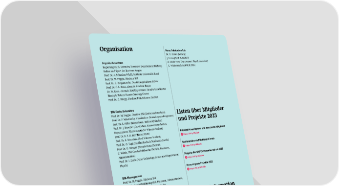 Organisation Nano Fabrication Lab Dr. G. Gadea (Leitung) J. Herzog (seit 01.11.2023) ArgoviaAusschuss A. Lücke (vom Departement Physik 昀椀nanziert) Regierungsrat A. Hürzeler, Vorsteher Departement Bildung, X. Wildermuth (seit 01.11.2023) Kultur und Sport des Kantons Aargau Prof. Dr. A. Schenker-Wicki, Rektorin Universität Basel Prof. Dr. M. Poggio, Direktor SNI Prof. Dr. C. Bergamaschi, Direktionspräsident FHNW Prof. Dr. G.-L. Bona, ehemals Direktor Empa Dr. W. Riess, ehemals IBM Department Head & Koordinator Binnig & Rohrer Nanotechnology Center Prof. Dr. C. Rüegg, Direktor Paul Scherrer Institut SNIExekutivkomitee Prof. Dr. M. Poggio, Direktor SNI (Doktorandenschule) Listen über Mitglieder Prof. Dr. P. Maletinsky, Vizedirektor (Nano-Argovia-Programm) Prof. Dr. S. Hiller (Biozentrum, Rektorat/Fakultät) und Projekte 2023 Prof. Dr. J. Huwyler (Curriculum Nanowissenschaften, Departement Pharmazeutische Wissenschaften)) Prof. Dr. R. Y. H. Lim (Biozentrum) Principal Investigators und assoziierte Mitglieder Prof. Dr. K. Moselund (Paul Scherrer Institut) https://bit.ly/3ToGa3l Prof. Dr. O. Tagit (Fachhochschule Nordwestschweiz) Prof. Dr. O. Wenger (Departement Chemie) Doktoranden und Doktorandinnen C. Wirth, SNI Geschäftsführerin SNI (HR, Finanzen, https://bit.ly/48Kzcdk Administration) Prof. Dr. I. Zardo (Nano Technology Center und Departement Projekte der SNIDoktorandenschule 2023 Physik) https://bit.ly/4c2yqve NanoArgoviaProjekte 2023 SNIManagement https://bit.ly/3v5c7Es Prof. Dr. M. Poggio, Direktor SNI C. Wirth, Geschäftsführung (HR, Finanzen, Administration) Dr. A. Baumgartner (Doktorandenschule) Dr. A. Car (Curriculum Nanowissenschaften) Dr. K. Beyer-Hans (Kommunikation, Outreach) Weitere Information Dr. G. Gadea (Nano Fabrication Lab) S. Hüni (Kommunikation, Outreach) Dr. C. Möller (Kommunikation, Medienkontakt, Social Media) Dr. M. Wegmann (Kommunikation, Outreach, Social Media) Wenn Sie mehr über das Swiss Nanoscience Institute wissen Dr. M. Wyss (Nano Imaging Lab) möchten, besuchen Sie doch unsere Webseite (www.nanosci- ence.ch) oder folgen Sie uns auf LinkedIn, X oder YouTube. Dort posten wir regelmässig Neuigkeiten aus dem Netzwerk. Curriculum Nanowissenschaften Dr. A. Car (Studienkoordinatorin) Wissenschaftliches Beiheft S. Chambers (Administration) Die wissenschaftlichen Berichte aller Nano-Argovia-Projekte und Projekte der SNI-Doktorandenschule aus dem Jahr 2023 昀椀nden Sie auch auf unserer Webseite oder scannen Sie einfach Nano Imaging Lab den QR-Code. Dr. M. Dürrenberger (Leitung bis 31.05.2023) https://bit.ly/3TrNwTL Dr. M. Wyss (Leitung ab 01.06.2023, TEM, FIB-SEM) E. Bieler (SEM) S. Erpel (SEM, TEM) D. Mathys (FIB-SEM, Bildbearbeitung) Dr. M. Schönenberger (AFM, LSM) Dr. A. Vogel (TEM, FIB-SEM) 60 SNI-Jahresbericht 2023