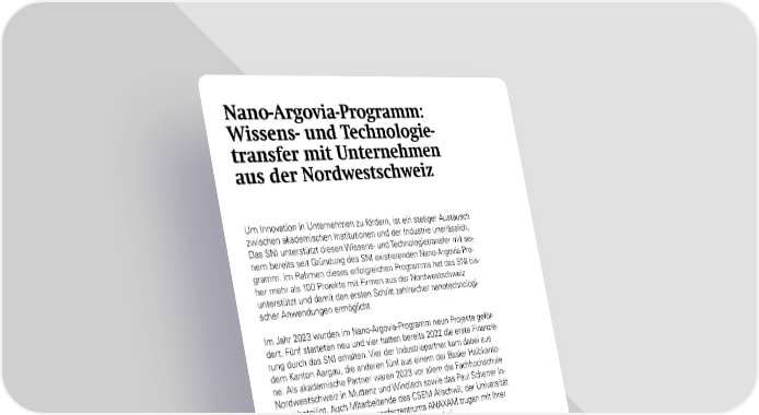 Nano-Argovia-Programm: Wissens- und Technologie- transfer mit Unternehmen aus der Nordwestschweiz Um Innovation in Unternehmen zu fördern, ist ein stetiger Austausch zwischen akademischen Institutionen und der Industrie unerlässlich. Das SNI unterstützt diesen Wissens- und Technologietransfer mit sei- nem bereits seit Gründung des SNI existierenden Nano-Argovia-Pro- gramm. Im Rahmen dieses erfolgreichen Programms hat das SNI bis- her mehr als 100 Projekte mit Firmen aus der Nordwestschweiz unterstützt und damit den ersten Schritt zahlreicher nanotechnologi- scher Anwendungen ermöglicht. Im Jahr 2023 wurden im Nano-Argovia-Programm neun Projekte geför- dert. Fünf starteten neu und vier hatten bereits 2022 die erste Finanzie- rung durch das SNI erhalten. Vier der Industriepartner kam dabei aus dem Kanton Aargau, die anderen fünf aus einem der Basler Halbkanto- ne. Als akademische Partner waren 2023 vor allem die Fachhochschule Nordwestschweiz in Muttenz und Windisch sowie das Paul Scherrer In- stitut beteiligt. Auch Mitarbeitende des CSEM Allschwil, der Universität Basel und des Technologietransferzentrums ANAXAM trugen mit ihrer Expertise zum Erfolg der Nano-Argovia-Projekte bei. 34 SNI-Jahresbericht 2023