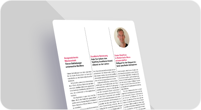 Ausgezeichnete Exzellente Betreuung Erster Abschluss Masterarbeit Anja Car bekam den in Medizinische Nano Timon Baltisberger Teaching Excellence Award wissenschaften untersuchte Bio昀椀lme «Dienst an der Lehre» Philippe Van der Stappen iso lierte spezi昀椀sche Zellregionen Timon Baltisberger hat 2023 den Preis Das Nanowissenschaftsstudium ist her- für die beste Masterarbeit in Nanowis- ausfordernd. Die Studierenden erklären Seit September 2021 haben Studierende senschaften an der Universität Basel be- aber immer wieder, dass sie die familiäre der Nanowissenschaften an der Universi- kommen. Atmosphäre untereinander schätzen und tät Basel die Möglichkeit «Medizinische Er hat in der prämierten Arbeit belegt, dass sie hervorragend betreut werden. Nanowissenschaften» in ihrem Masterstu- dass Vibrio cholerae Bakterien im Inne- Aufgrund zahlreicher positiver Rück- dium als Vertiefungsfach zu wählen. 2023 ren eines Bio昀椀lms toleranter gegenüber meldungen von Studierenden der Nano- hat der junge Aargauer Philippe Van der verschiedenen Antibiotika sind als Kultu- wissenschaften wurde die Studiengangs- Stappen als erster seinen Master in dieser ren, die schüttelnd in Flüssigmedium koordinatorin Dr. Anja Car 2023 für den nanomedizinisch geprägten Ausrichtung wachsen. von der Universität Basel verliehenen abgeschlossen. Die Ergebnisse tragen dazu bei, Bio- Teaching Excellence Awards 2023 «Dienst Für seine Masterarbeit hat er einen 昀椀lme, die in der Natur eine grosse Rolle an der Lehre» nominiert und anschlie- Argovia-Grant bekommen, um an der Mo- spielen und zu hartnäckigen Infektionen ssend von Studiendekaninnen und -deka- nash University (Clayton, Australien) in beim Menschen führen können, besser nen der Universität als Preisträgerin aus- der Gruppe von Professor Dr. Alex de zu verstehen. gewählt. Im Mai 2023 bekam Anja Car Marco zu arbeiten. Er hat dort eine Me- Im Anschluss an sein Masterstudium diese Auszeichnung verliehen, die ein thode entwickelt, um bestimmte Regio- in Nanowissenschaften hat der junge Aar- Beleg für ihr ausserordentliches Engage- nen einer Zelle zu isolieren. Diese soge- gauer begonnen an der Universität Basel ment zum Wohle der Studierenden ist. nannten subzellulären Regionen können seine Doktorarbeit zu schreiben. Jedoch Beitrag über den Werdegang von Anja Car: für verschiedene nachgeschaltete Unter- nicht – wie man vermuten könnte – über https://bit.ly/3QM68eG suchungen wie die Analyse der gesamten ein biologisch-medizinisches Thema, son- Video mit Anja Car: Proteine (Proteomik) oder der Genexpres- dern in der Quantenphysik. Das zeigt ein- https://youtu.be/mgfWGBSfYCg sion (Transkriptomik) verwendet werden. mal mehr, wie vielfältig die Nanostudie- Beitrag über den Auslandsaufenthalt von renden ausgebildet sind. Philippe Van der Stappen: https://bit.ly/40SVOWR Bericht Masterarbeit Timon Baltisberger: https://bit.ly/3sOb7Ue «Durch ihr unermüdliches Video mit Timon Baltisberger: Engagement trägt Anja Car https://youtu.be/4zZjnvXqUQ massgeblich zum Erfolg des «Die Vertiefungsrichtung Medi einzigartigen Studiengangs zinische Nanowissenschaften Nanowissenschaften bei. Als ist etwas ganz Besonderes, da Koordinatorin leistet sie ausser sich das Vorlesungsangebot «Timon hat in seiner Masterar ordentliches – und das aus über mehrere Departemente er beit den Grundstein dafür ge organisatorischer und mensch streckt. Man erhält einzigartige legt wie wir die Wirksamkeit licher Sicht.» Einsichten – von Molekularer von Antibiotika in bakteriellen Prof. Dr. Philipp Habegger Medizin über Biokompatibilität Gemeinschaften untersuchen Studiendekan Philosophisch-Na- bis zur Datenanalyse bildge können.» turwissenschaftliche Fakultät, bender Verfahren.» Prof. Dr. Knut Drescher, Universität Basel Philippe Van der Stappen, Biozentrum, Universität Basel Biozentrum, Universität Basel 14 SNI-Jahresbericht 2023
