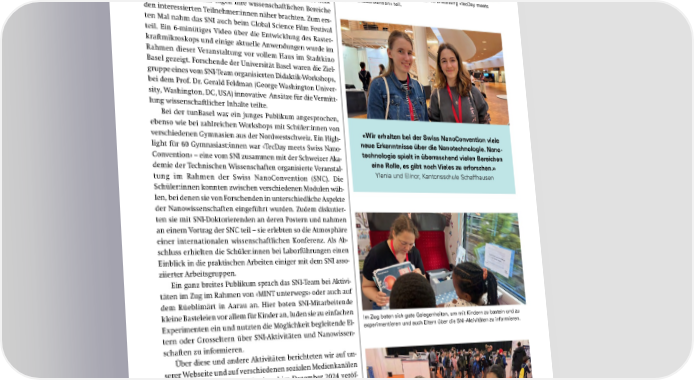 Auf dem Rüeblimärt, im Labor, im Vortrags raum oder auch online Unterschiedliche Formate für verschiedene Zielgruppen Im Jahr 2024 nutzte das SNI-Team wieder ganz unterschiedliche Plattformen, um mit verschiedenen Zielgruppen in Kontakt zu kommen, sie über Nanowissenschaften zu informieren und ge- nerell das Interesse für Naturwissenschaften zu wecken. So gab es beispielsweise Anfang des Jahres eine Zusammenarbeit mit Sechzig Gymnasiast:innen nahmen an der Veranstaltung «TecDay meets der Volkshochschule beider Basel, bei der Forschende aus dem Swiss NanoConvention» teil. SNI-Netzwerk an fünf Tagen ihre wissenschaftlichen Bereiche den interessierten Teilnehmer:innen näher brachten. Zum ers- ten Mal nahm das SNI auch beim Global Science Film Festival teil. Ein 6-minütiges Video über die Entwicklung des Raster- kraftmikroskops und einige aktuelle Anwendungen wurde im Rahmen dieser Veranstaltung vor vollem Haus im Stadtkino Basel gezeigt. Forschende der Universität Basel waren die Ziel- gruppe eines vom SNI-Team organisierten Didaktik-Workshops, bei dem Prof. Dr. Gerald Feldman (George Washington Univer- sity, Washington, DC, USA) innovative Ansätze für die Vermitt- lung wissenschaftlicher Inhalte teilte. Bei der tunBasel war ein junges Publikum angesprochen, ebenso wie bei zahlreichen Workshops mit Schüler:innen von «Wir erhalten bei der Swiss NanoConvention viele verschiedenen Gymnasien aus der Nordwestschweiz. Ein High- neue Erkenntnisse über die Nanotechnologie. Nano light für 60 Gymnasiast:innen war «TecDay meets Swiss Nano- technologie spielt in überraschend vielen Bereichen Convention» – eine vom SNI zusammen mit der Schweizer Aka- eine Rolle, es gibt noch Vieles zu erforschen.» demie der Technischen Wissenschaften organisierte Veranstal- Ylenia und Elinor, Kantonsschule Schaffhausen tung im Rahmen der Swiss NanoConvention (SNC). Die Schüler:innen konnten zwischen verschiedenen Modulen wäh- len, bei denen sie von Forschenden in unterschiedliche Aspekte der Nanowissenschaften eingeführt wurden. Zudem diskutier- ten sie mit SNI-Doktorierenden an deren Postern und nahmen an einem Vortrag der SNC teil – sie erlebten so die Atmosphäre einer internationalen wissenschaftlichen Konferenz. Als Ab- schluss erhielten die Schüler:innen bei Laborführungen einen Einblick in die praktischen Arbeiten einiger mit dem SNI asso- ziierter Arbeitsgruppen. Ein ganz breites Publikum sprach das SNI-Team bei Aktivi- täten im Zug im Rahmen von «MINT unterwegs» oder auch auf dem Rüeblimärt in Aarau an. Hier boten SNI-Mitarbeitende kleine Basteleien vor allem für Kinder an, luden sie zu einfachen Experimenten ein und nutzten die Möglichkeit begleitende El- Im Zug boten sich gute Gelegenheiten, um mit Kindern zu basteln und zu experimentieren und auch Eltern über die SNI-Aktivitäten zu informieren. tern oder Grosseltern über SNI-Aktivitäten und Nanowissen- schaften zu informieren. Über diese und andere Aktivitäten berichteten wir auf un- serer Webseite und auf verschiedenen sozialen Medienkanälen – oft auch mit Videos. Im Juni und im Dezember 2024 veröf- fentlichte das SNI sein elektronisches Magazin «SNI INSight», mit Einblicken in unterschiedliche Forschungsthemen und ei- ner Übersicht über SNI-Aktivitäten. Weitere Informationen: YouTubeKanal: https://bit.ly/3u9XLjv LinkedIn: https://bit.ly/3rbYP4s Bluesky: https://bsky.app/profile/sniunibas.bsky.social SNIWebseite: www.nanoscience.ch Die tunBasel ist immer wieder eine tolle Gelegenheit, um zahlreiche Kinder SNI INSight: https://bit.ly/4aEtInm und Jugendliche zu erreichen, mit ihnen zu experimentieren und ihnen zu Experimente für zuhause: http://bit.ly/3Hw1FIk zeigen, wie spannend die Naturwissenschaften sind. SNI-Jahresbericht 2024 65