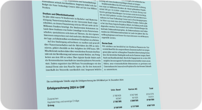 Ausbau des Nano Technology Centers sich die Kosten für Öffentlichkeitsarbeit und interne Veranstal- Das 2022 gegründete Nano Technology Center mit seinen beiden tungen auf weniger als 0.2 Millionen Franken. Einheiten Nano Imaging Lab und Nano Fabrication Lab bietet Kund:innen aus Industrie und Akademie einen umfassenden Ser- Investition in moderne Infrastruktur vice in den Bereichen Bildgebung und Analyse sowie Mikro- und Dank angesparter Rücklagen konnte das SNI im Jahr 2024 über Nanofabrikation. 0.6 Millionen Franken in neue Infrastruktur in einigen For- Mit der strategischen Fokussierung auf Nanoimaging und Na- schungsgruppen und vor allem im Nano Technology Center in- nofabrikation ist es für das SNI elementar, in den beiden Service- vestieren. Der kontinuierliche Aufbau der Serviceeinheit des SNI einheiten des Nano Technology Centers eine moderne, konkur- sowie die strukturelle Unterstützung von Forschungsgruppen renzfähige Infrastruktur zu schaffen und aufrecht zu erhalten. wird sich in den nächsten Jahren fortsetzen. Damit wird das SNI Aufgrund von Rücklagen konnte das SNI im Jahr 2024 weiterhin seine Rücklagen abbauen und dazu beitragen, die technische Aus- in die Ausstattung des Nano Technology Centers investieren und stattung auf einen konkurrenzfähigen Stand zu bringen. war in der Lage, notwendige Reparaturen und Instandhaltungs- Im Jahresabschluss des SNI wird in der letzten Zeile ein Betrag massnahmen zeitnah durchzuführen. Insgesamt belief sich das von rund 4.9 Millionen Franken als «Stand gebundene Projekt- Budget des Nano Technology Centers 2024 auf fast eine Million mittel SNI per 31.12.2024» ausgewiesen. In diesem Betrag sind Franken. bereits getätigte Bestellungen von Geräten nicht berücksichtigt, die erst 2025 geliefert werden. Dazu gehören Infrastrukturmass- Studium und Öffentlichkeitsarbeit nahmen im Nano Technology Center und in Forschungsgruppen Im Jahr 2024 waren 76 Studierende im Bachelor- und Masterstu- im Wert von rund einer dreiviertel Million Franken. Zudem gibt diengang Nanowissenschaften an der Universität Basel einge- es bei den Nano-Argovia-Projekten Mittel, die bislang noch nicht schrieben, an dessen Finanzierung sich das SNI mit mehr als 0.5 abgerufen wurden. Ein Grossteil sind zudem Rückstellungen für Millionen Franken beteiligt. Die Studierenden bekommen im laufende Doktorarbeitsprojekte, da Doktorandinnen und Dokto- Laufe ihres Studiums eine breite Grundlage in den Naturwissen- randen der SNI-Doktorandenschule im Laufe des Jahres ihre An- schaften, spezialisieren sich dann auf Themen, die den eigenen stellung beginnen und immer für einen Zeitraum von 48 Monaten Interessen entsprechen und sind nach dem Abschluss bestens in angestellt werden. der Lage, an Schnittstellen verschiedener Disziplinen zu arbeiten. Auf den Studiengang aufmerksam zu machen und generell Besten Dank über Nanowissenschaften und die Aktivitäten des SNI zu infor- Wir möchten uns herzlich bei der Direktion Finanzen der Uni- mieren, gehört ebenfalls zu den Aufgaben des SNI-Teams. SNI- versität Basel für die ausgezeichnete Zusammenarbeit im vergan- Mitarbeitende suchen daher über verschiedene Formate den Kon- genen Jahr und die reibungslose Finanzberichterstattung bedan- takt mit der Bevölkerung und nutzen soziale Medien, um Neuig- ken. Ein herzlicher Dank geht auch an die Kantone Aargau, Basel- keiten aus dem SNI zu teilen. Über digitale Kanäle findet auch Stadt und Basellandschaft. Durch ihr Engagement ist es dem SNI die Kommunikation innerhalb des interdisziplinären Netzwerks möglich, herausragende Nachwuchswissenschaftler:innen auszu- statt. Zudem organisiert das SNI-Team Veranstaltungen wie den bilden, neue wissenschaftliche Erkenntnisse zu gewinnen und Annual Event oder den NanoTec Apéro, die für den Austausch Unternehmen bei innovativen Projekten für eine bessere Zukunft innerhalb des Netzwerks unerlässlich sind. Insgesamt beliefen zu unterstützen. Die nachfolgende Tabelle zeigt die Erfolgsrechnung der SNI-Mittel per 31. Dezember 2024: Erfolgsrechnung 2024 in CHF Univ. Basel Kanton AG Total Zusprachen 2’766’439 5‘247‘940 8’014’379 Kapitalertrag und sonstige Erträge 18’947 151’625 170’571 Ertrag 2’785’385 5’399’565 8’184’950 Aufwand 3’109’549 5’777’990 8’887’539 Jahresüberschuss (324’164) (378’425) (702’589) Stand gebundene Projektmittel SNI per 01.01.2024 1’989’547 3’577’167 5’566’715 Zuweisung (+)/Auflösung (–) gebundene Projektmittel (324’164) (378’425) (702’589) Stand gebundene Projektmittel SNI per 31.12.2024 in CHF 1’665’383 3’198’742 4’864’125 SNI-Jahresbericht 2024 67