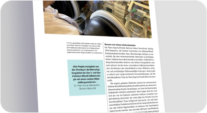 In einer geschützten Atmosphäre setzt der Dokto- Bessere und sichere Lithiumbatterien rand Robin Wullich Prototypen der Lithium-Me- Im Nano-Argovia-Projekt BatCoat haben Forschende Anfang tall-Festkörperbatteriezelle ohne Materialüber- schuss zusammen, um anschliessend ihre 2024 begonnen, die nächste Generation von Lithium-Metall- elektrochemischen Eigenschaften zu untersuchen. Festkörperbatteriezellen ohne überschüssiges Lithium zu ent- wickeln, die eine vielversprechende Alternative zu herkömm- lichen Lithium-Ionen-Batteriezellen darstellen. Li-Metall-Fest- körperbatteriezellen besitzen eine höhere Energiedichte und «Das Projekt ermöglicht uns sind sicherer als die heute verwendeten Lithium-Ionen-Batte- den Einstieg in die Wertschöp rien. Sie könnten also entscheidend zu einer effektiven, siche- fungskette der Gen 3 und Gen ren und nachhaltigen Elektromobilität beitragen. Zurzeit gibt 4LithiumMetallZelltechnolo es jedoch noch einige technische Herausforderungen, die das gie mit einem starken Allein interdisziplinäre Team im Nano-Argovia-Projekt BatCoat unter- stellungsmerkmal.» sucht. Dr. Phani Kumar Yalamanchili, Die negativ geladene Elektrode (Anode) der untersuchten Oerlikon Metco AG Lithium-Metall-Festkörperbatteriezellen besteht aus einem drei- dimensionalem Kupfer Stromfänger, auf dem die Forschenden funktionale Schichten abscheiden. Diese tragen dazu bei, dass sich das von der Kathode emittierte Lithium reversibel und gleichmässig abscheidet. Im ersten Jahr des Projekts hat das interdisziplinäre Team erfolgreich untersucht, wie sich diese nanoskaligen Funktionsschichten auf der Anode abscheiden las- sen und welche Eigenschaften sie besitzen. Die Forschenden haben bereits erreicht, dass sich über 200 Lade- und Entladezy- 2 klen bei einer Stromdichte von 0.5 mA/cm mit einem geringen Kapazitätsverlust von 20 % realisieren lassen. Im zweiten Jahr besteht das Ziel darin, diese Leistungsfähigkeit zu verdoppeln oder zu verdreifachen, um sie für die Batterieindustrie attraktiv zu machen. Kooperation von: Paul Scherrer Institut PSI // Hochschule für Technik und Umwelt FHNW // Oerlikon Metco AG (Woh len, AG) Projektbeschreibung: https://bit.ly/3CiMofk SNI-Jahresbericht 2024 37