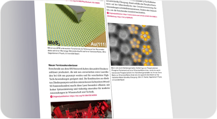 Reibung hängt von Geschwindigkeit ab 2DSchicht aus PhosphorPentameren: Auch auf Metall mit Auf der Nanometerskala hängen Reibungskräfte von der Ge- Halbleitereigenschaften schwindigkeit ab, wie Forschende von der Universität Basel ge- Forschende der Universität Basel haben auf einer Silberoberflä- zeigt haben. Die Forschenden haben dazu die Spitze eines Ras- che Fünferringe von Phosphoratomen (Phosphor-Pentamere terkraftmikroskops (AFM für Atomic Force Microscope) über eine (Cyclo-P5)) synthetisiert und ihre elektronischen Eigenschaften Monolage Molybdändisulfid auf einer Goldoberfläche bewegt. erstmals mithilfe kombinierter Rasterkraft- und Rastertunnel- Sie stellten fest, dass in einem breiten Geschwindigkeitsbereich spektroskopie untersucht. Sie stellten dabei fest, dass die ato- von 10 bis 100 Nanometern pro Sekunde, die Reibung zwischen mare Phosphor-Pentamerschicht ihre Halbleitereigenschaften der AFM-Spitze und der Oberfläche abnimmt. Diese Ergebnisse beibehält und sich an der Grenzfläche zur Silberoberfläche eine weichen vom dem klassischen Coulomb-Gesetz ab, das die Un- spezielle elektronische Schnittstelle ausbildet (p-Typ-Halbleiter- abhängigkeit der Reibung von der Geschwindigkeit beschreibt. Metall-Schottky-Übergang). Damit erfüllen die Phosphor-Penta- Originalpublikation: https://doi.org/10.1103/PhysRevLett.133.136201 mere auf der Silberoberfläche eine Grundvoraussetzung für Anwendungen in Feldeffekttransistoren, Dioden oder Solarzel- len, wie die Forschenden kürzlich beschrieben. Originalpublikation: https://www.nature.com/articles/s41467024508624 SNIMeldung: https://bit.ly/4jAWwRt Mit einem AFM untersuchen Forschende die Reibung auf der Nanometer- skala auf einer Monolage Molybdändisulfid auf einer Goldoberfläche. (Bild: Departement Physik, Universität Basel) Neuer Femtosekundenlaser Forschende aus dem SNI-Netzwerk haben Alexandrit-Ultrakurz- Wenn sich durch Selbstorganisation Fünferringe von Phosphoratomen zeitlaser produziert, die mit neu entwickelten roten Laserdio- (Phosphor-Pentamere) auf einer Silberoberfläche bilden, behält die zweidi- mensionale Phosphorschicht ihre Halbleitereigenschaften bei. An der Grenz- den bei 638 nm gepumpt werden und für verschiedene High- fläche zur Silberoberfläche bildet sich eine spezielle Schnittstelle (p-Typ- Tech-Anwendungen geeignet sind. Die Kombination aus direk- Halbleiter-Metall-Schottky-Übergang). (Bild: R. Pawlak, Departement Physik, ten Diodenpumpen und den extrem kurzen Lichtpulsen (44 und Universität Basel) 95 Femtosekunden) macht diese Laser besonders efÏzient, mit hoher Spitzenleistung und vielseitig einsetzbar für moderne Anwendungen in Wissenschaft und Technik. Originalpublikation: https://doi.org/10.1364/OE.542834 Die Forschenden haben den neu entwickelten Femtosekundenlaser im Rah- men des Nano-Argovia-Projekts NanoFemto Tweezer eingesetzt, um optische Pinzetten zu entwickeln. SNI-Jahresbericht 2024 31