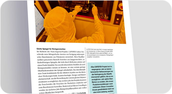 Fototermin 20.1. Glatte Spiegel für Röntgenstrahlen Im PICO Reinraum des Park Innovaare bearbeiten Im Rahmen des Nano-Argovia-Projekts CAPOFOX haben For- die Forschenden im Nano-Argovia-Projekt CAPO- schende neue lithografische Ansätze zur Fertigung mikroopti- FOX lichtempfindliche Lacke auf Wafern, um da- mit anschliessend die verbesserten Röntgenkapil- scher Bauelemente aus Polymeren entwickelt. Diese Kapillar- laroptiken herzustellen. optiken genannten Bauteile bestehen aus langgestreckten, zy- linderförmigen Spiegeln, die Licht durch Reflexion präzise auf einen Punkt bündeln. Um sowohl ultraviolette Strahlen als auch Röntgenstrahlen nutzen zu können, ist eine extrem geringe «Das CAPOFOXProjekt hat im Oberflächenrauheit der Spiegel erforderlich. Das interdiszipli- vergangenen Jahr zu bemer näre Team kombinierte für die Arbeiten Aspekte aus den Berei- kenswerten Verbesserungen bei chen Werkzeugtechnik, Lasertechnologie, Design und Materi- der Verringerung der Oberflä alwissenschaft, um die Herstellung der extrem glatten Polymer- chenrauheit geführt, die es uns strukturen zu möglichen. Im zweiten Jahr des Projekts konnten ermöglichen, sehr glatte Ober die Forschenden die Ursachen der Rauheiten ermitteln und flächen zu erzielen, die unsere erste Bauelemente herstellen. Basierend auf diesen Grundlagen Produktentwicklungen stark werden im nächsten Jahr Röntgenkapillaroptiken mit verbes- verbessern. Dieser innovative serten Oberflächen hergestellt. Ansatz gewährleistet nicht nur Kooperation von: Paul Scherrer Institut PSI // Hochschule eine hohe Leistung, sondern für Life Sciences FHNW // XRnanotech AG (Villigen, AG) öffnet auch die Tür zu wirkungs Projektbeschreibung: https://bit.ly/48Dj5zg vollen Anwendungen in der Zu kunft. Wir freuen uns, Teil eines solchen transformativen Fort schritts zu sein.» Dr. Florian Döring, XRnanotech AG 42 SNI-Jahresbericht 2024