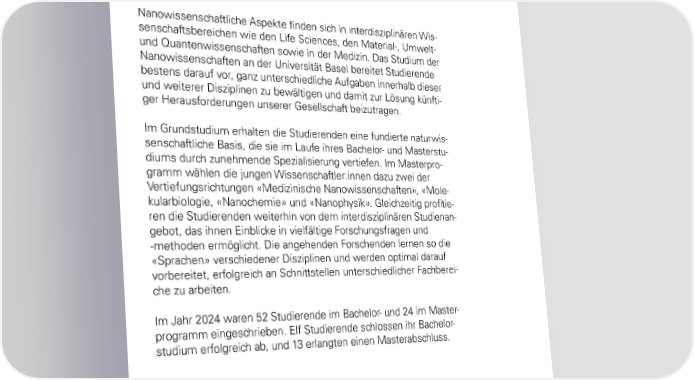 Studium Nanowissenschaften: Vielfältig, anspruchsvoll und aktueller denn je Nanowissenschaftliche Aspekte finden sich in interdisziplinären Wis- senschaftsbereichen wie den Life Sciences, den Material-, Umwelt- und Quantenwissenschaften sowie in der Medizin. Das Studium der Nanowissenschaften an der Universität Basel bereitet Studierende bestens darauf vor, ganz unterschiedliche Aufgaben innerhalb dieser und weiterer Disziplinen zu bewältigen und damit zur Lösung künfti- ger Herausforderungen unserer Gesellschaft beizutragen. Im Grundstudium erhalten die Studierenden eine fundierte naturwis- senschaftliche Basis, die sie im Laufe ihres Bachelor- und Masterstu- diums durch zunehmende Spezialisierung vertiefen. Im Masterpro- gramm wählen die jungen Wissenschaftler:innen dazu zwei der Vertiefungsrichtungen «Medizinische Nanowissenschaften», «Mole- kularbiologie, «Nanochemie» und «Nanophysik». Gleichzeitig profitie- ren die Studierenden weiterhin von dem interdisziplinären Studienan- gebot, das ihnen Einblicke in vielfältige Forschungsfragen und -methoden ermöglicht. Die angehenden Forschenden lernen so die «Sprachen» verschiedener Disziplinen und werden optimal darauf vorbereitet, erfolgreich an Schnittstellen unterschiedlicher Fachberei- che zu arbeiten. Im Jahr 2024 waren 52 Studierende im Bachelor- und 24 im Master- programm eingeschrieben. Elf Studierende schlossen ihr Bachelor- studium erfolgreich ab, und 13 erlangten einen Masterabschluss. 12 SNI-Jahresbericht 2024