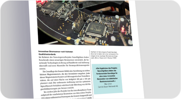 Innovativer Stromsensor nach höchsten Das Team im Nano-Argovia-Projekt NanoHigh- Qualitätsstandards Sens hat im letzten Jahr einen verbesserten Pro- Im Rahmen des Nano-Argovia-Projekts NanoHighSens haben totypen eines neuartigen Stromsensors herge- stellt. (Bild: J. Pascal und H. Nicolas, FHNW) Forschende einen neuartigen Stromsensor entwickelt, der be- stehende Technologien in Bezug auf Bandbreite und Auflösung übertrifft und neue Massstäbe für Stromqualitätsmessgeräte ersetzt. «Die Ergebnisse des Projekts Die Grundlage des Sensors bildet eine Anordnung aus sieben NanoHighSens liefern die kleinen Magnetometern, die den Stromleiter umgeben. Jeder fundamentale Grundlage für dieser Magnetometer basiert auf 100 magnetischen Tunnelkon- eine neue, innovative takten, die auf einer Fläche von lediglich 100 μm x 100 μm Generation von elektrischer platziert sind. Die verbesserte Auflösung und das optimierte Starkstromsensorik.» Signal-Rausch-Verhältnis wird durch die Mittelung von 100 Ma- Max Ulrich gnetfeldmessungen pro Sensor erreicht. Camille Bauer Metrawatt AG Im zweiten Jahr des Projekts hat das interdisziplinäre Team aufgrund der erarbeiteten Kenntnisse aus dem ersten Projekt- jahr einen verbesserten Prototypen des Sensors hergestellt und diesen charakterisiert. Zudem hat der Industriepartner Camille Bauer Metrawatt das Gerät in seinen Testbereich integriert und geprüft. Kooperation von: Hochschule für Life Sciences FHNW // Hochschule für Technik und Umwelt FHNW // Camille Bau er Metrawatt AG (Wohlen, AG) Projektbeschreibung: https://bit.ly/3S2nDIq 44 SNI-Jahresbericht 2024