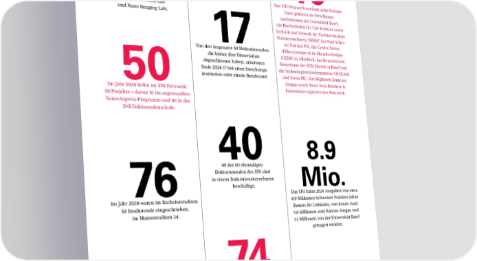 174 Zum SNI-Netzwerk gehören 174 Mitglieder (Projektleitende, Doktorierende, 10 Management, freiwillige Mitglieder, Das SNI-Netzwerk umfasst zehn Partner. Nano Fabrication Lab Dazu gehören als Forschungs- und Nano Imaging Lab). institutionen die Universität Basel, die Hochschulen für Life Sciences sowie Technik und Umwelt der Fachhochschule Nord westschweiz FHNW, das Paul Scher- 17 rer Institut PSI, das Centre Suisse Von den insgesamt 60 Doktorierenden, d'Electronique et de Microtechnique die bisher ihre Dissertation (CSEM) in Allschwil, das Departement abgeschlossen haben, arbeiteten Biosysteme der ETH Zürich in Basel und Ende 2024 17 bei einer Forschungs- die Technologietransferzentren A NAXAM institution oder einem Bundesamt. und Swiss PIC. Das Hightech Zentrum 50 Aargau sowie Basel Area Business & Im Jahr 2024 liefen im SNI-Netzwerk Innovation ergänzen das Netzwerk. 50 Projekte – davon 10 im angewandten Nano-Argovia-Programm und 40 in der SNI-Doktorandenschule. 40 8.9 40 der 60 ehemaligen Doktorierenden des SNI sind in einem Industrieunternehmen beschäftigt. Mio. 76 Das SNI hatte 2024 Ausgaben von etwa Im Jahr 2024 waren im Bachelorstudium 8.9 Millionen Schweizer Franken (ohne 52 Studierende eingeschrieben, Kosten für Gebäude), von denen rund im Masterstudium 24. 5.8 Millionen vom Kanton Aargau und 3.1 Millionen von der Universität Basel 74 getragen wurden. 73+130 Im Jahr 2024 wurden 74 Im Jahr 2024 haben 73 verschiedene Veröffentlichungen in renommierten Nutzer:innen den Service des Nano Fab- Wissenschaftszeitschriften mit rication Labs in Anspruch genommen. Beteiligung von SNI-Mitgliedern >7000 Das Nano Imaging Lab erhielt 2024 veröffentlicht. Mehr als 7000 Interessierte folgen den mehr als 180 Aufträge von 130 verschie- Social Media-Kanälen des SNI auf denen Kund:innen, wobei diese Aufträge LinkedIn, Bluesky, X, Instagram und oft mehrere Tage in Anspruch nehmen. YouTube. SNI-Jahresbericht 2024 9