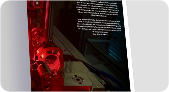 Zusammenarbeit als Schlüssel für Innovation Das NanoArgoviaProgramm des SNI ist ein Garant für effek tiven Wissens und Technologietransfer zwischen Forschungs einrichtungen und Industrieunternehmen aus der Nordwest schweiz. Jedes Jahr unterstützt das SNI etwa zehn angewandte Forschungsprojekte, bei denen interdisziplinäre Teams an der Lösung ganz unterschiedlicher Herausforderungen arbeiten. Mehr dazu ab Seite 36 Laser spielten bereits bei einigen NanoArgoviaProjekten eine Rolle. In dem Projekt NanoFemto Tweezers werden neuartige Laser in Kombination mit nanooptischen Elementen als optische Pinzetten eingesetzt. Die Forschenden wollen damit unterschied liche Zelltypen auf engstem Raum präzise anordnen und später als Testsysteme nutzen. Mehr dazu auf Seite 43 SNI-Jahresbericht 2024 35