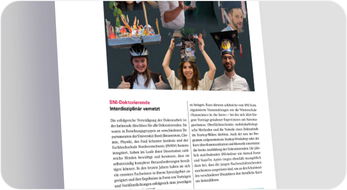 Im Jahr 2024 haben sieben SNI-Doktorie- rende ihre Dissertation erfolgreich abge- schlossen. Ihre experi- mentellen Arbeiten dazu haben sie am Biozentrum, an den Departementen Chemie und Physik der Universität Basel, an der Hochschule für Life Science FHNW oder am Paul Scherrer Institut durchgeführt. SNIDoktorierende zu bringen. Dazu dienten zahlreiche vom SNI-Team Interdisziplinär vernetzt organisierte Veranstaltungen wie die Winterschule «Nanoscience in the Snow» – bei der sich 2024 län- Die erfolgreiche Verteidigung der Doktorarbeit ist gere Vorträge geladener Expert:innen um Nanoma- der krönende Abschluss für alle Doktorierenden. Sie gnetismus, Oberflächenchemie, molekularbiologi- waren in Forschungsgruppen an verschiedenen De- sche Methoden und die Vorteile eines Doktortitels partementen der Universität Basel (Biozentrum, Che- im Startup-Milieu drehten. Auch der neu ins Pro- mie, Physik), des Paul Scherrer Instituts und der gramm aufgenommene Startup-Workshop oder der Fachhochschule Nordwestschweiz (FHNW) bestens Kurs über Kommunikation und Rhetorik unterstützt integriert, haben im Laufe ihrer Dissertation zahl- die breite Ausbildung der Doktorierenden. Die jähr- reiche Hürden bewältigt und bewiesen, dass sie lich stattfindenden SNI-Anlässe wie Annual Event selbstständig komplexe Herausforderungen bewäl- und NanoTec Apéro trugen ebenfalls massgeblich tigen können. In den letzten Jahren haben sie sich dazu bei, dass die jungen Nachwuchsforschenden ein enormes Fachwissen in ihrem Spezialgebiet an- nun bestens ausgerüstet sind, um an den Schnittstel- geeignet und ihre Ergebnisse in Form von Vorträgen len verschiedener Disziplinen ihre berufliche Karri- und Veröffentlichungen erfolgreich dem jeweiligen ere fortzuführen. Fachpublikum präsentiert. Die Doktorierenden der SNI-Doktorandenschule haben sich jedoch nicht nur ein Netzwerk innerhalb ihres Forschungsgebiets aufgebaut, sondern sind «Die SNIDoktorandenschule habe ich als auch Teil des interdisziplinären SNI-Netzwerks ge- extrem wertvoll erlebt mit lebendigem Aus worden. Sie haben sich mit Themen weit ausserhalb tausch, interdisziplinären Möglichkeiten sich ihres Fachgebiets auseinandergesetzt, sich in andere weiter zu entwickeln, über den Horizont zu Forschungsthemen hineingedacht und mit For- blicken und mit Menschen zu vernetzen.» schenden anderer Disziplinen diskutiert. Zudem ha- Annika Huber, ehemalige Doktorandin der SNI- ben sie gelernt auch einem anspruchsvollen, fach- Doktorandenschule fremden Personenkreis die eigene Forschung näher 20 SNI-Jahresbericht 2024