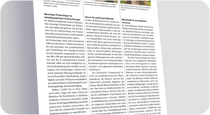 Melissa Carrillo hat für ihre Doktorarbeit am Paul Annika Huber hat ihre Doktorarbeit am Departe- Maria-Elisenda Alaball Pujol hat für ihre Doktorar- Scherrer Institut gearbeitet und ist jetzt als Post- ment Chemie der Universität Basel absolviert. beit am Biozentrum der Universität Basel ge- doktorandin an der Northwestern University in forscht. Chicago IL (USA). Neuartiger Probenträger für Sensor für gasförmige Moleküle Mikrofluidik für die Antibiotika kristallographische Untersuchungen In ihrer Doktorarbeit hat Dr. Annika Hu- forschung Dr. Melissa Carrillo hat in ihrer Doktorar- ber ein Nanomaterial entwickelt, das sich Dr. Maria-Elisenda Alaball Pujol hat im beit neuartige Probenträger aus Polyme- als Sensor für bestimmte gasförmige Mo- Rahmen ihrer Doktorarbeit ein integrier- ren entwickelt und getestet, die sich bes- leküle eignet. Dabei handelt es sich um tes Mikrofluid-System entwickelt, mit tens für die Untersuchung von Protein- asymmetrische Moleküle, die zwar die dem sich quantifizieren lässt, wie Bakte- kristallen an Synchrotron- und Freie-Elek- gleiche chemische Formel besitzen, de- rien auf verschiedene Antibiotika reagie- tronen-Röntgenlaserquellen eignen. ren Spiegelbilder aber nicht deckungs- ren abhängig von ihrem physiologischen Als Probenträger dient eine transparente gleich sind. Diese sogenannten Enantio- Zustand. Die Methode erlaubt es, antimi- mikrostrukturierte Polymermembran, mere haben die gleichen physikalischen krobielle Verbindungen zu identifizieren, die mit tausenden von pyramidenförmi- Eigenschaften, drehen aber polarisiertes die sich speziell gegen resistente Subpo- gen Vertiefungen mit winzigen Löchern Licht in unterschiedliche Richtungen pulationen einsetzen lassen und beste- an der Unterseite ausgestattet ist. In die- (rechts- und linksdrehend). Da die biolo- hende Behandlungen ergänzen können. 2 sen 100 x 100 µm grossen Kavitäten rich- gischen Wirkungsweisen sehr verschie- Für ihre Untersuchungen hat Maria- ten sich die zu analysierenden Protein- den sein können, ist es wichtig die beiden Elisenda einen integrierten mikrofluidi- kristalle selbst aus und ermöglichen da- Enantiomere getrennt voneinander nach- schen und rechnergestützten Aufbau mit die Bestimmung ihrer Position vor der zuweisen – was aufgrund der Ähnlichkeit (Dual-Input Mother Machine) weiterent- Analyse. Der Probenträger zeichnet sich schwierig ist. wickelt und genutzt. Hierbei wachsen die durch minimale Hintergrundsignale, be- Das entwickelte Nanomaterial be- Bakterien in engen Wachstumskanälen, nutzerfreundliche Handhabung, Langle- steht aus quadratisch-planaren Platin- die senkrecht zu einem Hauptkanal ver- bigkeit und hohe Wiederverwendbarkeit komplexen, die bekannt sind für ihre laufen. Die Bakterien können dabei mit aus. Zudem bietet er das Potenzial für eine Eigenschaft, gestapelte Aggregate mit verschiedenen Nährmedien unter ein- kostengünstige Massenanfertigung. kurzen Metall–Metall Abständen zu bil- stellbaren Bedingungen versorgt und un- Melissa Carillo hat in ihrer Arbeit den. Dies kann zu eindimensionalen Na- terschiedlichen Antibiotika ausgesetzt auch einen Träger mit einer schwarzen nostrukturen führen, die eine hohe elek- werden. Die Bildanalyse-Software Mother Membran für Experimente an lichtemp- trische Leitfähigkeit, Vapochromie und Machine Analyzer erlaubt das Wachstum findlichen Proteinen entwickelt. Damit Photolumineszenz aufweisen. Mithilfe und die Entwicklung der Bakterien kon- konnte sie die Ligand-Bindung eines licht- von Modifikationen an den Platinkomple- tinuierlich zu verfolgen. Maria-Elisenda gesteuerten Systems untersuchen, mit xen induzierte Annika Huber eine asym- hat neue mikrofluidische Schaltungen dem Ziel die strukturelle Dynamik von metrische Stapelung, die unterschiedlich entwickelt, welche die parallele Untersu- Bindungsvorgängen zu entschlüsseln. auf die links- bzw. rechtsdrehende Form chung verschiedener Antibiotika und Publikation: https://bit.ly/3WefdQX der nachzuweisenden Molekülpaare re- Bakterienstämme erlauben. Mit der agiert. Anhand von fünf getesteten Mole- neuen Technologie war sie in der Lage, külpaaren konnte Annika zeigen, dass einzelne Bakterien vor, während und sich die Platinkomplexe prinzipiell als nach der Antibiotikagabe zu verfolgen enantiospezifischer Sensor eignen. So und deren Überleben zu bewerten. Für könnte sie beispielsweise klimarelevante die Untersuchungen konzentrierte sie Terpene spezifisch aus der Atmosphäre sich auf die Behandlung von Escherichia nachweisen. coli mit einer Reihe Antibiotika in kli- Video: https://youtu.be/8JxTRe8rRPo nisch relevanten Konzentrationen. SNI-Jahresbericht 2024 17
