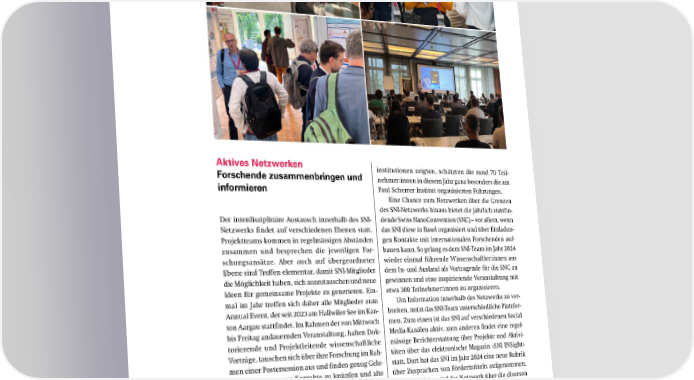Sowohl beim NanoTec Apéro (links oben) wie auch bei der Swiss NanoConvention und dem Annual Event des SNI (rechts unten) steht der Austausch über aktuelle Forschungsprojekte und das Knüpfen und Vertiefen von Kontak- ten im Vordergrund. Aktives Netzwerken institutionen zeigten, schätzten die rund 70 Teil- Forschende zusammenbringen und nehmer:innen in diesem Jahr ganz besonders die am informieren Paul Scherrer Institut organisierten Führungen. Eine Chance zum Netzwerken über die Grenzen des SNI-Netzwerks hinaus bietet die jährlich stattfin- Der interdisziplinäre Austausch innerhalb des SNI- dende Swiss NanoConvention (SNC) – vor allem, wenn Netzwerks findet auf verschiedenen Ebenen statt. das SNI diese in Basel organisiert und über Einladun- Projektteams kommen in regelmässigen Abständen gen Kontakte mit internationalen Forschenden auf- zusammen und besprechen die jeweiligen For- bauen kann. So gelang es dem SNI-Team im Jahr 2024 schungsansätze. Aber auch auf übergeordneter wieder einmal führende Wissenschaftler:innen aus Ebene sind Treffen elementar, damit SNI-Mitglieder dem In- und Ausland als Vortragende für die SNC zu die Möglichkeit haben, sich auszutauschen und neue gewinnen und eine inspirierende Veranstaltung mit Ideen für gemeinsame Projekte zu generieren. Ein- etwa 300 Teilnehmer:innen zu organisieren. mal im Jahr treffen sich daher alle Mitglieder zum Um Information innerhalb des Netzwerks zu ver- Annual Event, der seit 2023 am Hallwiler See im Kan- breiten, nutzt das SNI-Team unterschiedliche Plattfor- ton Aargau stattfindet. Im Rahmen der von Mittwoch men. Zum einen ist das SNI auf verschiedenen Social bis Freitag andauernden Veranstaltung, halten Dok- Media-Kanälen aktiv, zum anderen findet eine regel- torierende und Projektleitende wissenschaftliche mässige Berichterstattung über Projekte und Aktivi- Vorträge, tauschen sich über ihre Forschung im Rah- täten über das elektronische Magazin «SNI INSight» men einer Postersession aus und finden genug Gele- statt. Dort hat das SNI im Jahr 2024 eine neue Rubrik genheiten, um neue Kontakte zu knüpfen und alte über Zusprachen von Fördermitteln aufgenommen. aufzufrischen. Auf diese Weise wird das Netzwerk über die diversen Ganz spezifisch um die angewandten Nano- Forschungsvorhaben der SNI-Mitglieder informiert Argovia-Projekte in Zusammenarbeit mit der Indus- und vielleicht auch animiert, Kontakt aufzunehmen trie geht es beim ebenfalls jährlich stattfindenden und neue Kooperationen zu initiieren. NanoTec Apéro. Im Jahr 2024 war der Park Innovaare NanoTec Apéro Eindrücke: https://youtube.com/shorts/ Gastgeber dieser immer wieder inspirierenden Ver- tDm5riP0UFo anstaltung. Neben den Vorträgen und Postern über Bericht Swiss NanoConvention: https://bit.ly/3DXhXfg (Seite aktuelle Projekte, die beispielhaft die exzellente Zu- 25) sammenarbeit zwischen Industrie und Forschungs- Video Swiss NanoConvention: https://youtu.be/d2SxVeCabT0 62 SNI-Jahresbericht 2024