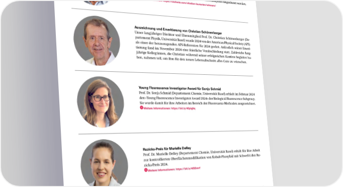 Auszeichnungen und Preise Clarivate Citation Laureate für Christoph Gerber Unser Ehrenmitglied Prof. Dr. Christoph Gerber (Departement Physik, Universität Basel) wurde für die Erfindung des Rasterkraftmikroskops dieses Jahr als Clarivate Citation Laureate ausgezeichnet. Jedes Jahr im September veröffentlicht der Medienkonzern Cla- rivate (UK) eine Liste von Wissenschaftler:innen, denen aufgrund häufiger Zitierungen in hochrangigen Wissenschaftsjournalen Chancen auf den Nobelpreis eingeräumt werden. Weitere Informationen: https://clarivate.com/citationlaureates/winners/ Auszeichnung und Emeritierung von Christian Schönenberger Unser langjähriger Direktor und Ehrenmitglied Prof. Dr. Christian Schönenberger (De- partement Physik, Universität Basel) wurde 2024 von der American Physical Society (APS) als einer der herausragenden APS-Referenten für 2024 geehrt. Anlässlich seiner Emeri- tierung fand im November 2024 eine feierliche Verabschiedung statt. Zahlreiche lang- jährige Kolleg:innen, die Christian während seiner erfolgreichen Karriere begleitet ha- ben, nahmen teil, um ihm für den neuen Lebensabschnitt alles Gute zu wünschen. Young Flourescence Investigator Award für Sonja Schmid Prof. Dr. Sonja Schmid (Departement Chemie, Universität Basel) erhielt im Februar 2024 den «Young Fluorescence Investigator Award 2024» der Biological Fluorescence Subgroup. Sie wurde damit für ihre Arbeiten im Bereich der Fluoreszenz-Methoden ausgezeichnet. Weitere Informationen: https://bit.ly/40pIg5q RuzickaPreis für Murielle Delley Prof. Dr. Murielle Delley (Departement Chemie, Universität Basel) erhält für ihre Arbeit zur kontrollierten Oberflächenmodifikation von Kobalt-Phosphid mit Schwefel den Ru- zicka-Preis 2024. Weitere Informationen: https://bit.ly/4iBSmrf Vielfältige Zusprachen für neue Forschungsprojekte Sehr erfolgreich waren SNI-Mitglieder im Jahr 2024 ebenfalls bei der Zusprache von Forschungsmitteln, die aus nationalen und internationalen Quellen kommen. In unserem elektronischen Magazin «SNI INSight» berichten wir seit 2024 über die verschiedenen neuen Forschungsprojekte, um den Austausch innerhalb des Netzwerks anzuregen. Zusprachen für neue Forschungsprojekte im ersten Halbjahr: https://bit.ly/4hpq6HS Zusprachen für neue Forschungsprojekte im zweiten Halbjahr: https://bit.ly/40NRrhC SNI-Jahresbericht 2024 63
