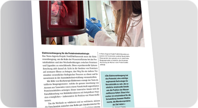 Elektronenbeugung für die Proteinstrukturbiologie Im Nano-Argovia-Projekt ProtEDinNanoxtals pro- Das Nano-Argovia-Projekt ProtEDinNanoxtals nutzt die Elekt- duzieren die Forschenden zunächst Nanokristalle. ronenbeugung, um die Rolle der Wasserstoffatome bei der Pro- Diese werden dann genutzt, um ein detailliertes Beugungsmuster zu erstellen, das die genaue teinfunktion und den Wechselwirkungen zwischen Proteinen Anordnung der Atome in dem Proteinmolekül und Liganden zu entschlüsseln. Diese experimentelle Spitzen- aufzeigt. forschung zielt darauf ab, Licht in die Struktur von Proteinen auf atomarer Ebene zu bringen, den Weg für ein tieferes Ver- ständnis wesentlicher biologischer Prozesse zu ebnen und In- novationen in der Arzneimittelentwicklung voranzutreiben. «Die Elektronenbeugung hat Mit Hilfe von Hochenergie-Elektronen erzeugt das Team de- das Potenzial, eine wichtige taillierte Beugungsmuster, welche die genaue Anordnung von ergänzende Technologie für Atomen aus Tausenden von in einem Nanokristall angeordneten Nanokristalle zu sein, die zu Proteinmolekülen aufzeigen. Dieser innovative Ansatz wird die sätzliche strukturelle Details Entschlüsselung von Molekülstrukturen mit beispielloser Präzi- wie die Position der Wasser sion ermöglichen – insbesondere die Position von Wasserstoffa- stoffatome liefert. Diese Infor tomen. mation ist entscheidend für die Um die Methode zu validieren und zu verfeinern, müssen Entwicklung besserer Medika die Forschenden zunächst eine Reihe gut charakterisierter Mo- mente, die Membranproteine dellproteine unterschiedlicher Grösse und Funktion untersu- als Ziel haben.» chen. Einen ersten Meilenstein erreichten sie durch Elektronen- Dr. Robert Cheng, beugungsbilder mit einer Auflösung von 1,2 Å. Das Team mit leadXpro AG Expert:innen aus Physik und Biologie wird nun schrittweise die Einstellungen des Elektronenmikroskops sowie die Proben ver- bessern und eine Pipeline aufbauen, um schliesslich pharma- zeutisch wichtige Membranproteine zu analysieren – ein ehr- geiziger Schritt zum Verständnis dieser wichtigen Biomoleküle. Die Lokalisierung der Position von Wasserstoffatomen in Mem- branproteinen liegt derzeit jenseits der Möglichkeiten anderer experimenteller Techniken wie der Röntgenkristallanalyse. 46 SNI-Jahresbericht 2024