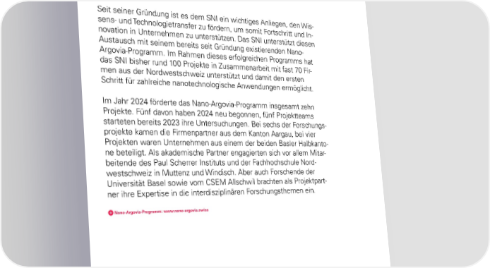 Nano-Argovia-Programm: Produktive Zusammenarbeit mit Firmen aus der Nordwest- schweiz Seit seiner Gründung ist es dem SNI ein wichtiges Anliegen, den Wis- sens- und Technologietransfer zu fördern, um somit Fortschritt und In- novation in Unternehmen zu unterstützen. Das SNI unterstützt diesen Austausch mit seinem bereits seit Gründung existierenden Nano- Argovia-Programm. Im Rahmen dieses erfolgreichen Programms hat das SNI bisher rund 100 Projekte in Zusammenarbeit mit fast 70 Fir- men aus der Nordwestschweiz unterstützt und damit den ersten Schritt für zahlreiche nanotechnologische Anwendungen ermöglicht. Im Jahr 2024 förderte das Nano-Argovia-Programm insgesamt zehn Projekte. Fünf davon haben 2024 neu begonnen, fünf Projektteams starteten bereits 2023 ihre Untersuchungen. Bei sechs der Forschungs- projekte kamen die Firmenpartner aus dem Kanton Aargau, bei vier Projekten waren Unternehmen aus einem der beiden Basler Halbkanto- ne beteiligt. Als akademische Partner engagierten sich vor allem Mitar- beitende des Paul Scherrer Instituts und der Fachhochschule Nord- westschweiz in Muttenz und Windisch. Aber auch Forschende der Universität Basel sowie vom CSEM Allschwil brachten als Projektpart- ner ihre Expertise in die interdisziplinären Forschungsthemen ein. NanoArgoviaProgramm: www.nanoargovia.swiss 36 SNI-Jahresbericht 2024