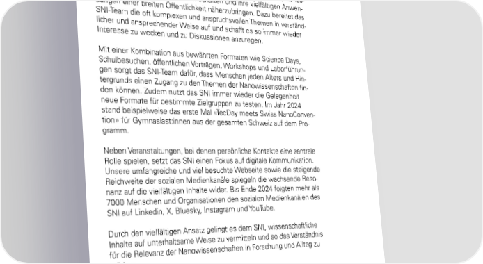 Kommunikation und Outreach: Förderung des Dialogs zwischen Forschung und Gesellschaft Eine wichtige Aufgabe des Swiss Nanoscience Institute ist es, die fas- zinierende Welt der Nanowissenschaften und ihre vielfältigen Anwen- dungen einer breiten Öffentlichkeit näherzubringen. Dazu bereitet das SNI-Team die oft komplexen und anspruchsvollen Themen in verständ - licher und ansprechender Weise auf und schafft es so immer wieder Interesse zu wecken und zu Diskussionen anzuregen. Mit einer Kombination aus bewährten Formaten wie Science Days, Schulbesuchen, öffentlichen Vorträgen, Workshops und Laborführun - gen sorgt das SNI-Team dafür, dass Menschen jeden Alters und Hin- tergrunds einen Zugang zu den Themen der Nanowissenschaften fin- den können. Zudem nutzt das SNI immer wieder die Gelegenheit neue Formate für bestimmte Zielgruppen zu testen. Im Jahr 2024 stand beispielweise das erste Mal «TecDay meets Swiss NanoConven - tion» für Gymnasiast:innen aus der gesamten Schweiz auf dem Pro- gramm. Neben Veranstaltungen, bei denen persönliche Kontakte eine zentrale Rolle spielen, setzt das SNI einen Fokus auf digitale Kommunikation. Unsere umfangreiche und viel besuchte Webseite sowie die steigende Reichweite der sozialen Medienkanäle spiegeln die wachsende Reso- nanz auf die vielfältigen Inhalte wider. Bis Ende 2024 folgten mehr als 7000 Menschen und Organisationen den sozialen Medienkanälen des SNI auf Linkedin, X, Bluesky, Instagram und YouTube. Durch den vielfältigen Ansatz gelingt es dem SNI, wissenschaftliche Inhalte auf unterhaltsame Weise zu vermitteln und so das Verständnis für die Relevanz der Nanowissenschaften in Forschung und Alltag zu stärken. 64 SNI-Jahresbericht 2024