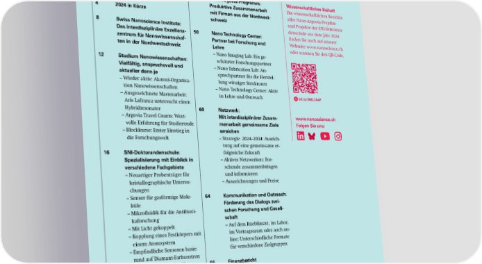 3 Editorial 36 NanoArgoviaProgramm: Wissenschaftliches Beiheft Produktive Zusammenarbeit Die wissenschaftlichen Berichte 4 2024 in Kürze mit Firmen aus der Nordwest aller Nano-Argovia-Projekte schweiz und Projekte der SNI-Doktoran- 8 Swiss Nanoscience Institute: denschule aus dem Jahr 2024 Das interdisziplinäre Exzellenz 50 Nano Technology Center: finden Sie auch auf unserer zentrum für Nanowissenschaf Partner bei Forschung und Webseite www.nanoscience.ch ten in der Nordwestschweiz Lehre oder scannen Sie den QR-Code. – Nano Imaging Lab: Ein ge- 12 Studium Nanowissenschaften: schätzter Forschungspartner Vielfältig, anspruchsvoll und – Nano Fabrication Lab: An- aktueller denn je sprechpartner für die Herstel- – Wieder aktiv: Alumni-Organisa- lung winziger Strukturen tion Nanowissenschaften – Nano Technology Center: Aktiv – Ausgezeichnete Masterarbeit: in Lehre und Outreach bit.ly/3WL7A4P Aris Lafranca untersucht einen Hybridresonator 60 Netzwerk: – Argovia Travel Grants: Wert- Mit interdisziplinärer Zusam www.nanoscience.ch volle Erfahrung für Studierende menarbeit gemeinsame Ziele Folgen Sie uns: – Blockkurse: Erster Einstieg in erreichen die Forschungswelt – Strategie 2024–2034: Ausrich- tung auf eine gemeinsame er- 16 SNIDoktorandenschule: folgreiche Zukunft Spezialisierung mit Einblick in – Aktives Netzwerken: For- verschiedene Fachgebiete schende zusammenbringen – Neuartiger Probenträger für und informieren kristallographische Untersu- – Auszeichnungen und Preise chungen – Sensor für gasförmige Mole- 64 Kommunikation und Outreach: küle Förderung des Dialogs zwi – Mikrofluidik für die Antibioti- schen Forschung und Gesell kaforschung schaft – Mit Licht gekoppelt – Auf dem Rüeblimärt, im Labor, – Kopplung eines Festkörpers mit im Vortragsraum oder auch on- einem Atomsystem line: Unterschiedliche Formate – Empfindliche Sensoren basie- für verschiedene Zielgruppen rend auf Diamant-Farbzentren – Ersatzgewebe für das Herz 66 Finanzbericht – SNI-Doktorierende: Interdiszip- linär vernetzt 68 Organisation – SNI Startup-Workshop: «From – Ausschüsse und Gremien Lab to Startup» – Listen Mitglieder und Projekte – Link zum wissenschaftlichen 24 Forschung: Teil und Impressum Grundlagenforschung bildet die Basis 2 SNI-Jahresbericht 2024